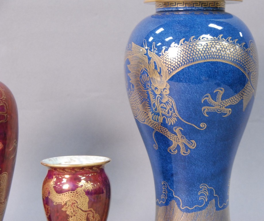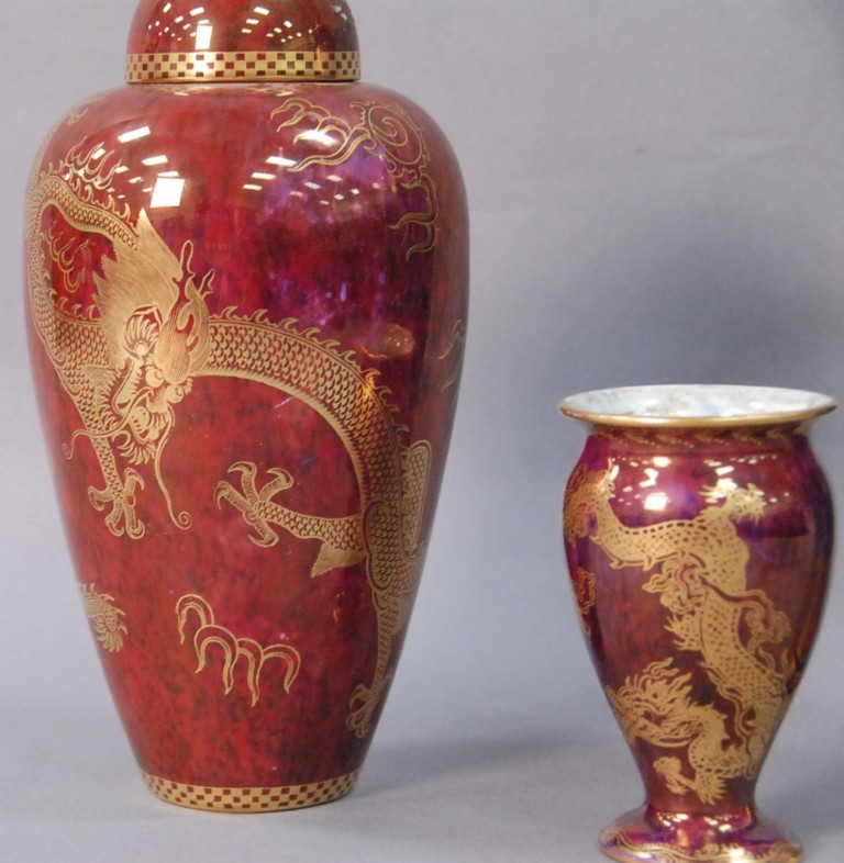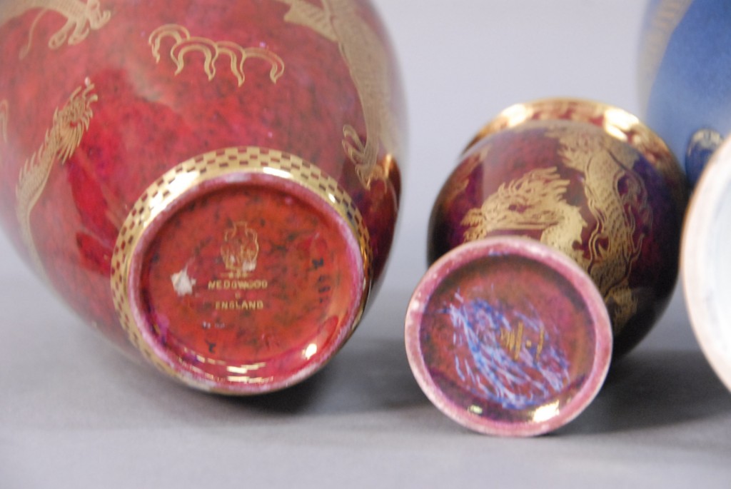 Wedgwood Fairy Luster footed vase Dragon Luster design, numbered Z4827, and two Wedgwood covered jars Dragon pattern. height 4 1/8in. top diameter 2in., total height 11 1/4in., total height 8 1/2in.