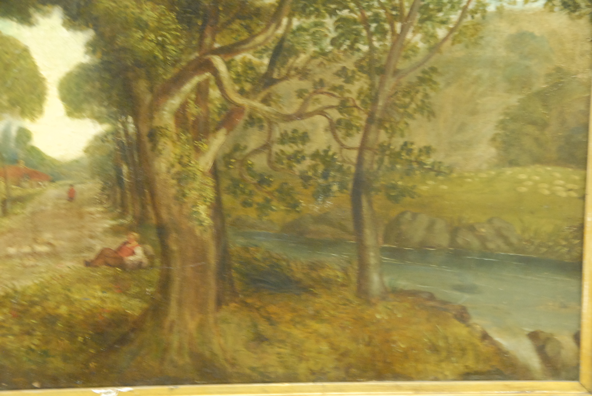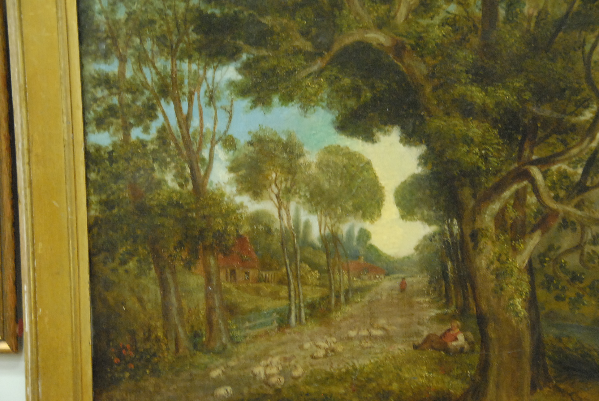 Primitive oil on canvas of a wooded and farm landscape with sheep.