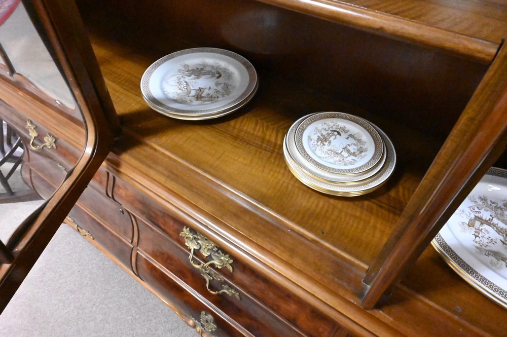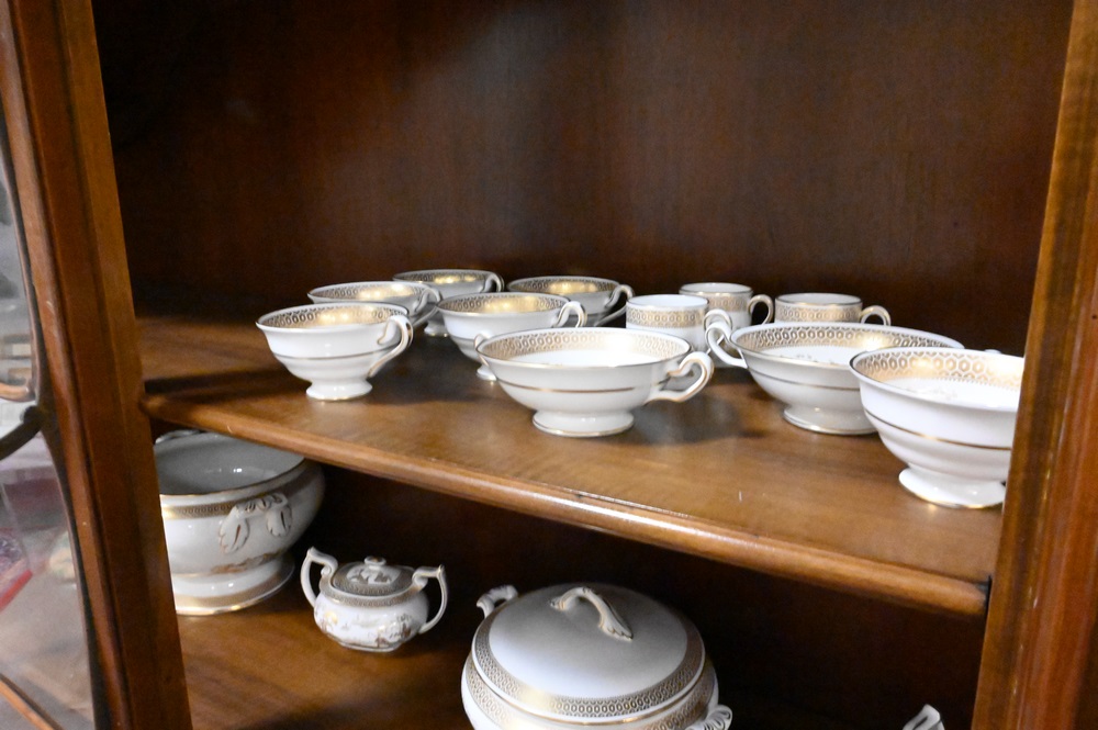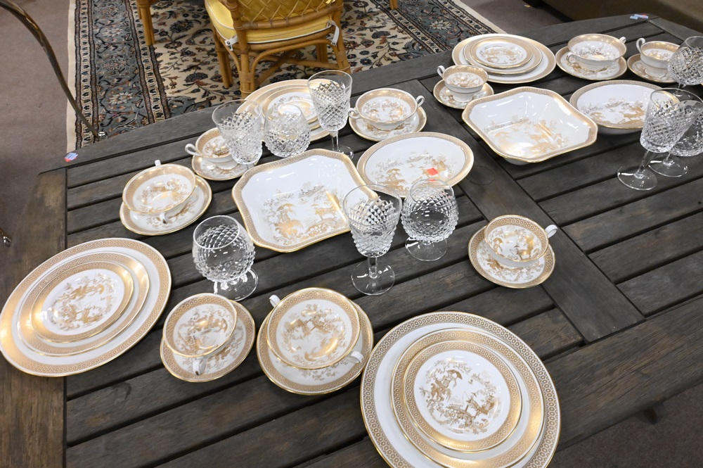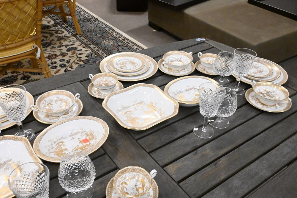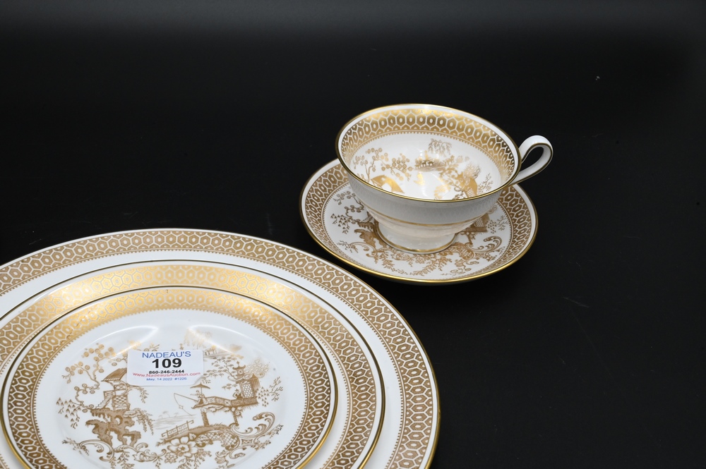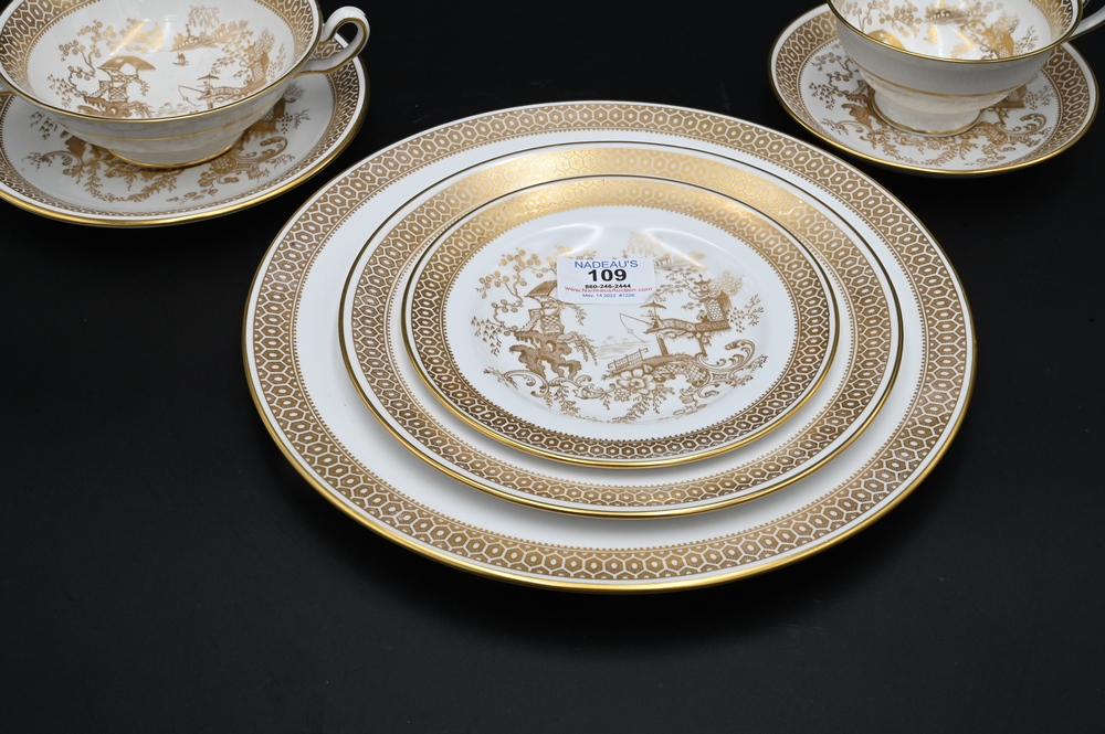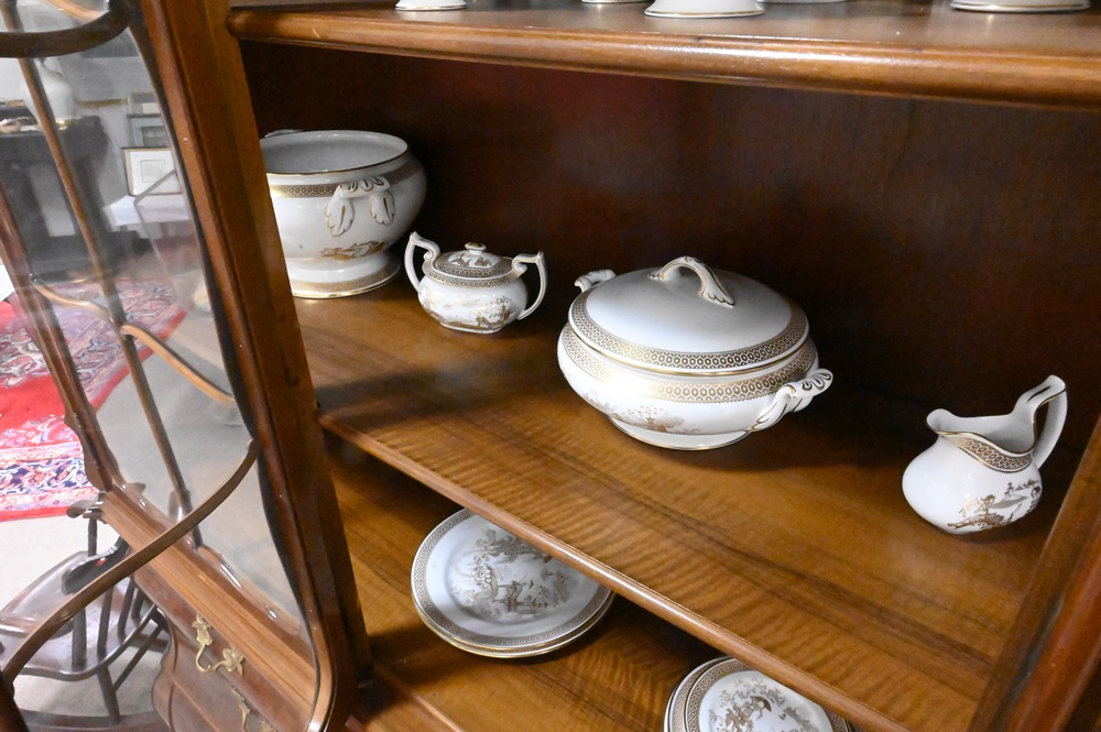 Lot 109: 72 Piece Spode Porcelain Dinner Set, “Spode’s Garden” having gilt chinoiseri motif, to include 8 dinner plates, 9 salad plates, 7 bread plates, 12 tea cups, 6 saucers, 3 espresso cups, 8 cream soup bowls, 8 cream soup under plates, 11 serving pieces. Provenance: Collections of Norma Reilly, New Jersey.