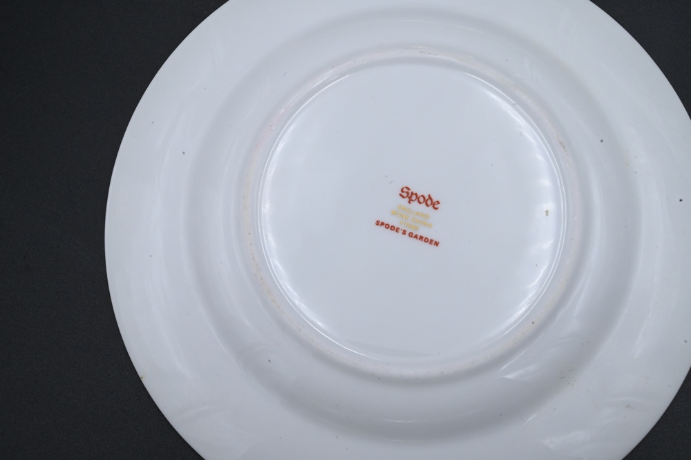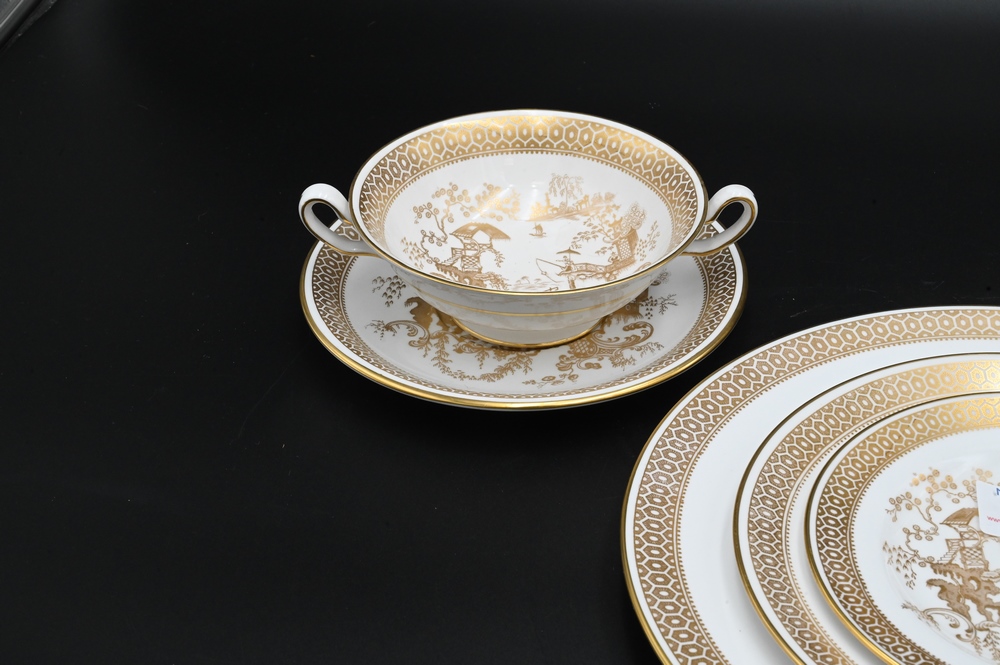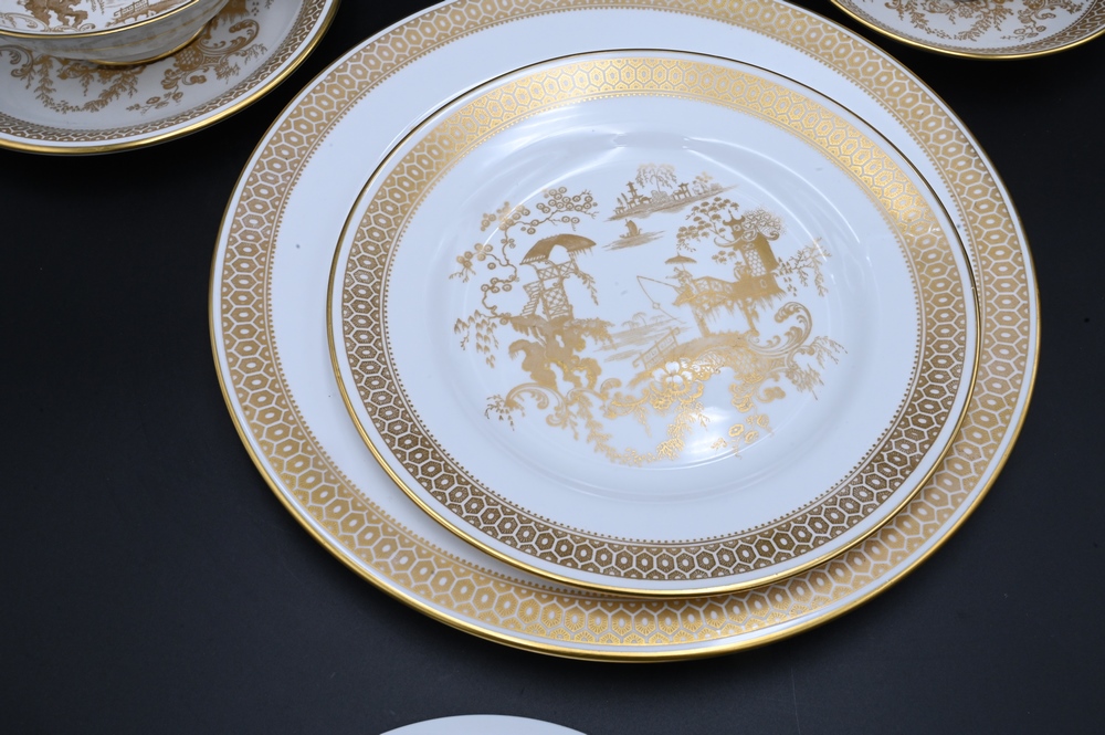 72 Piece Spode Porcelain Dinner Set, “Spode’s Garden” having gilt chinoiseri motif, to include 8 dinner plates, 9 salad plates, 7 bread plates, 12 tea cups, 6 saucers, 3 espresso cups, 8 cream soup bowls, 8 cream soup under plates, 11 serving pieces. Provenance: Collections of Norma Reilly, New Jersey.