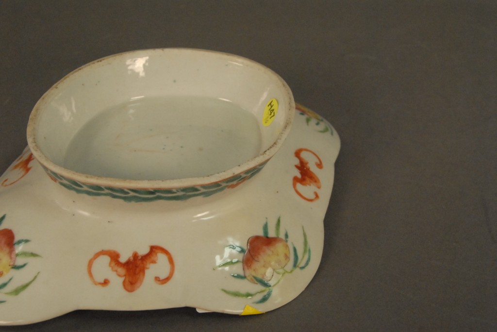 Lot 109: Famille Rose footed butterfly dish with two men in a boat, peach and bat decoration around exterior, ht. 3, lg. 8 1/2.