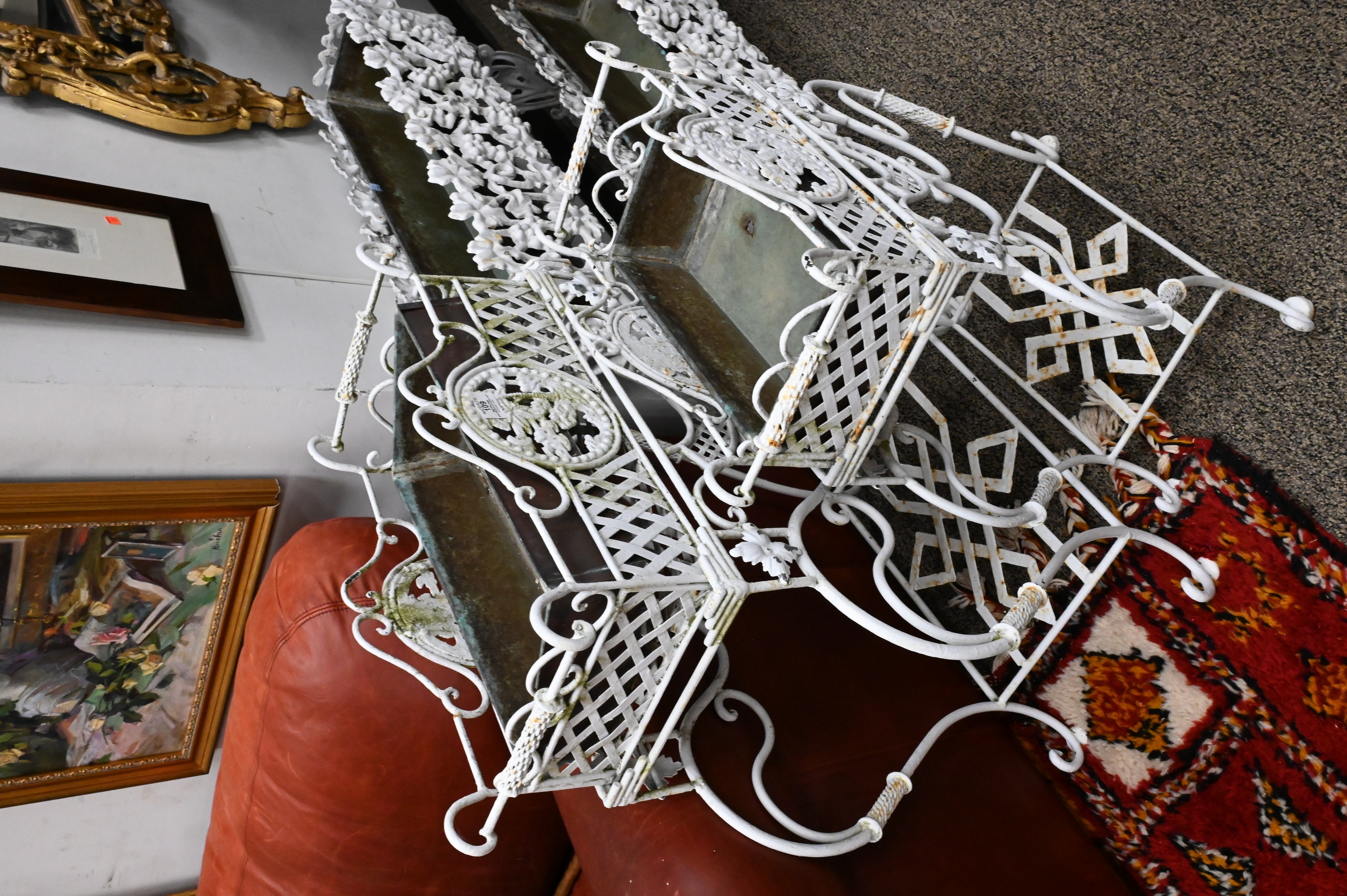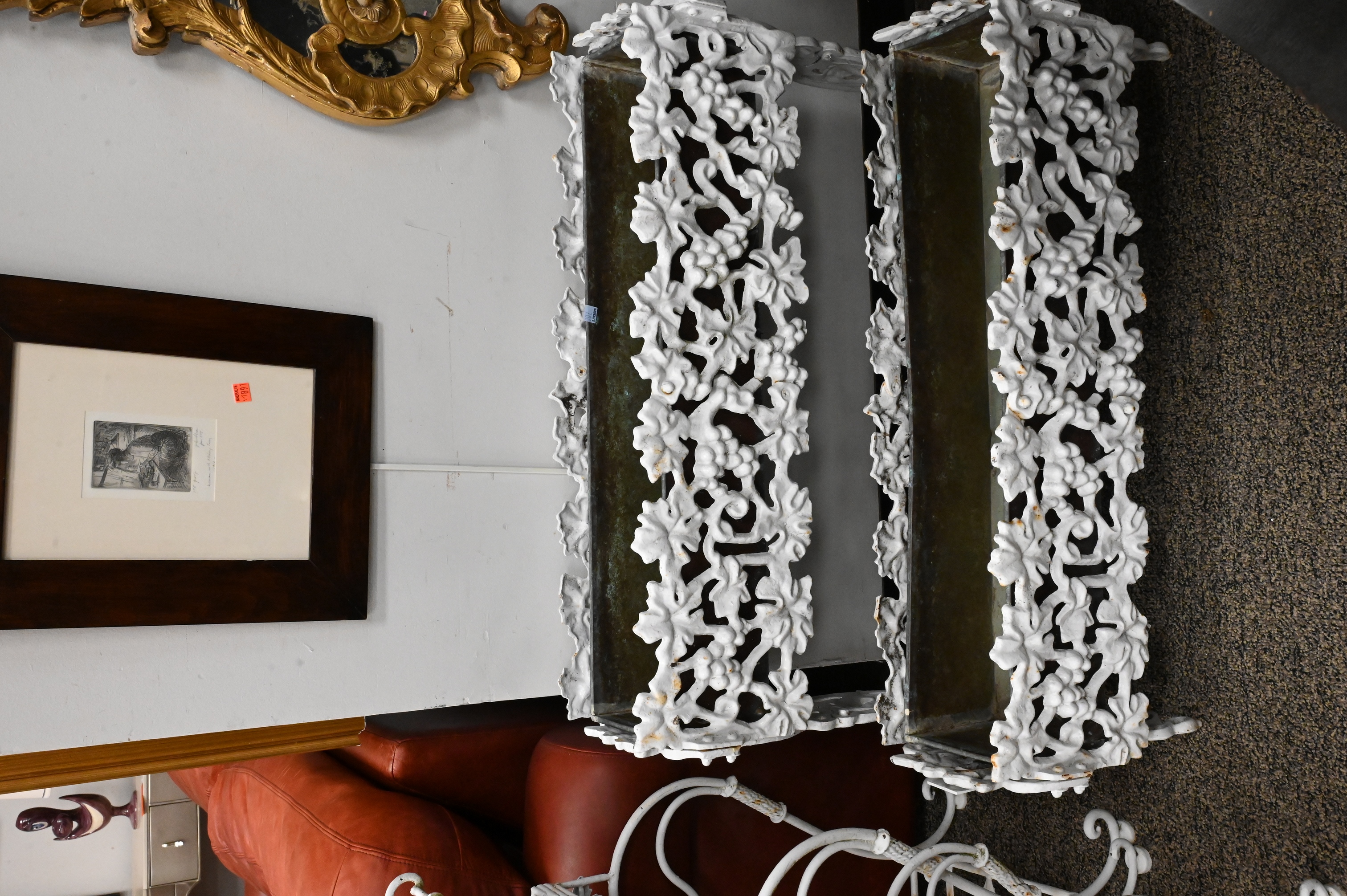 to include two ornate two part planters on stands along with two cast iron grape vine and leaf motif planters, all white painted