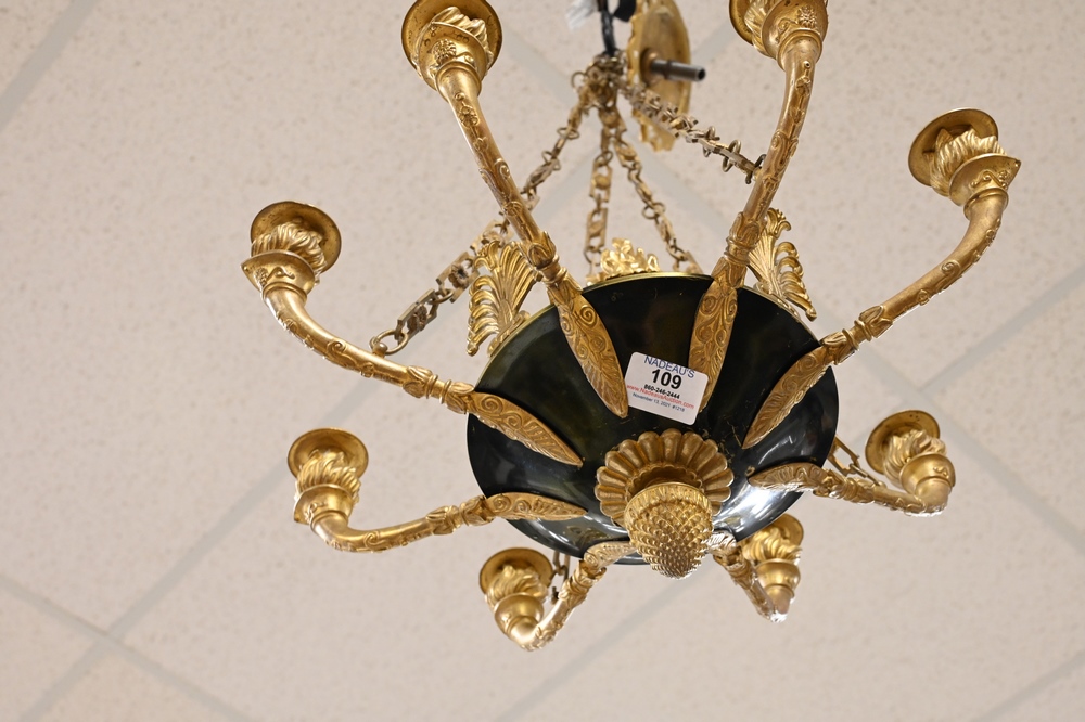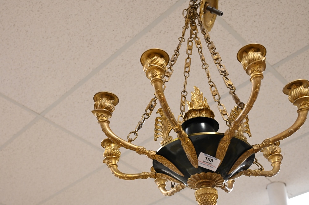 Lot 109: French Empire Style Hanging Light, having eight gilt bronze torch light holders with green patinated metal body, height 11 inches, diameter 18 inches.