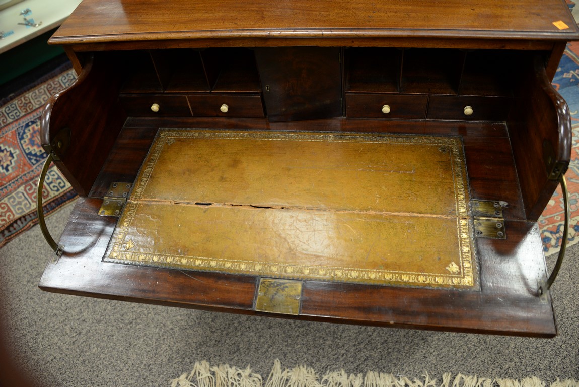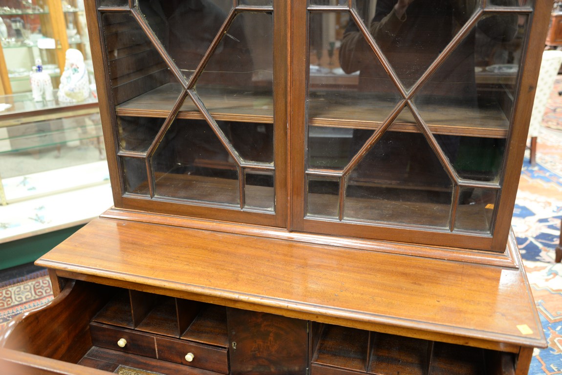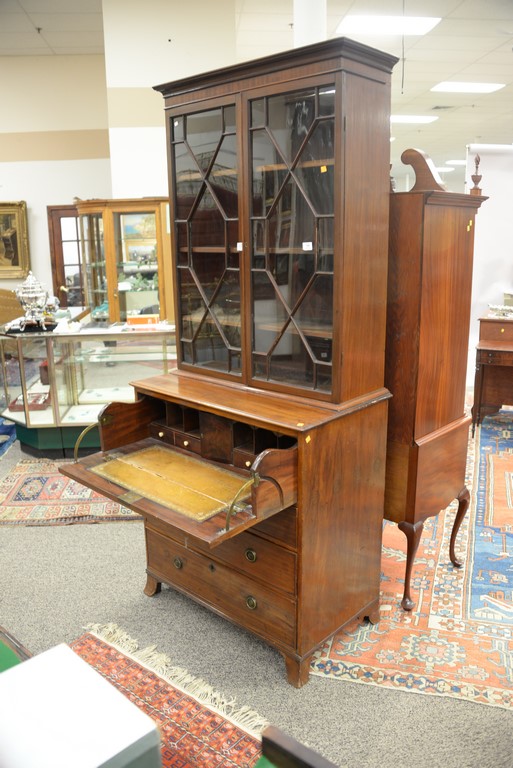 George III mahogany butler’s secretary desk in two parts, upper section with two glazed doors on lower section with pull out desk over three drawers on flared French feet, early 19th century.