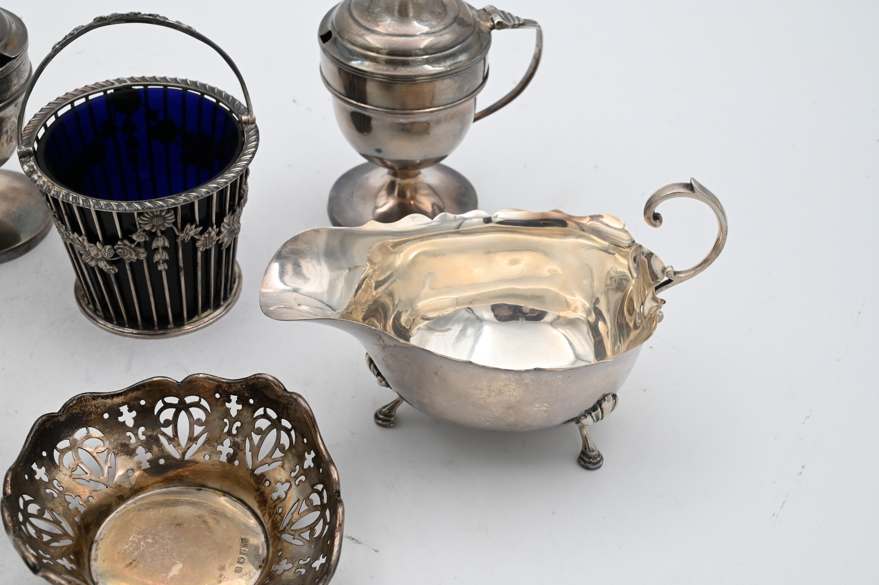 to include a pair of gravy boats, creamer, pair of lidded sugars, pair of repousse spoons, pierced tray and basket