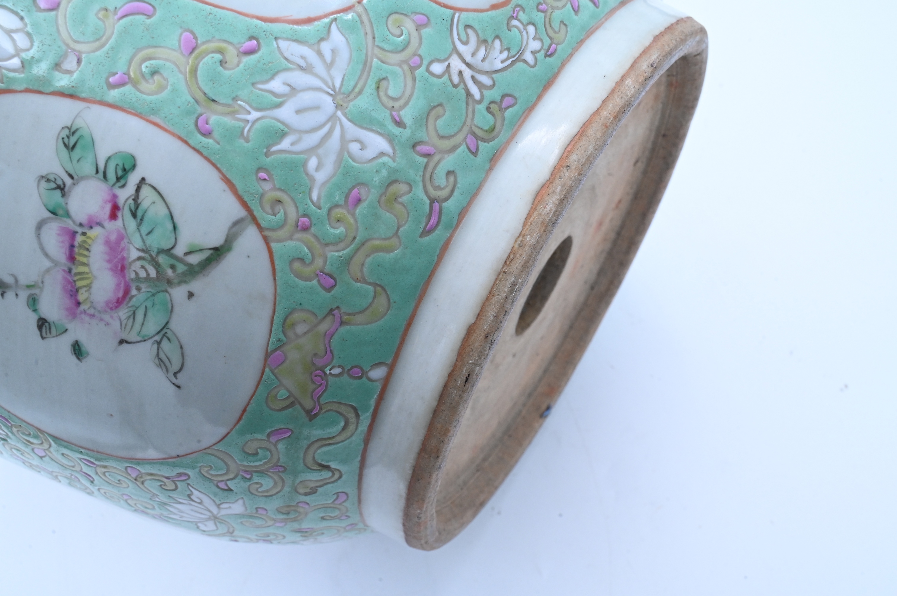 having green ground with cartouches featuring scholars as well as flower and bird motif, drilled drainage hole to bottom