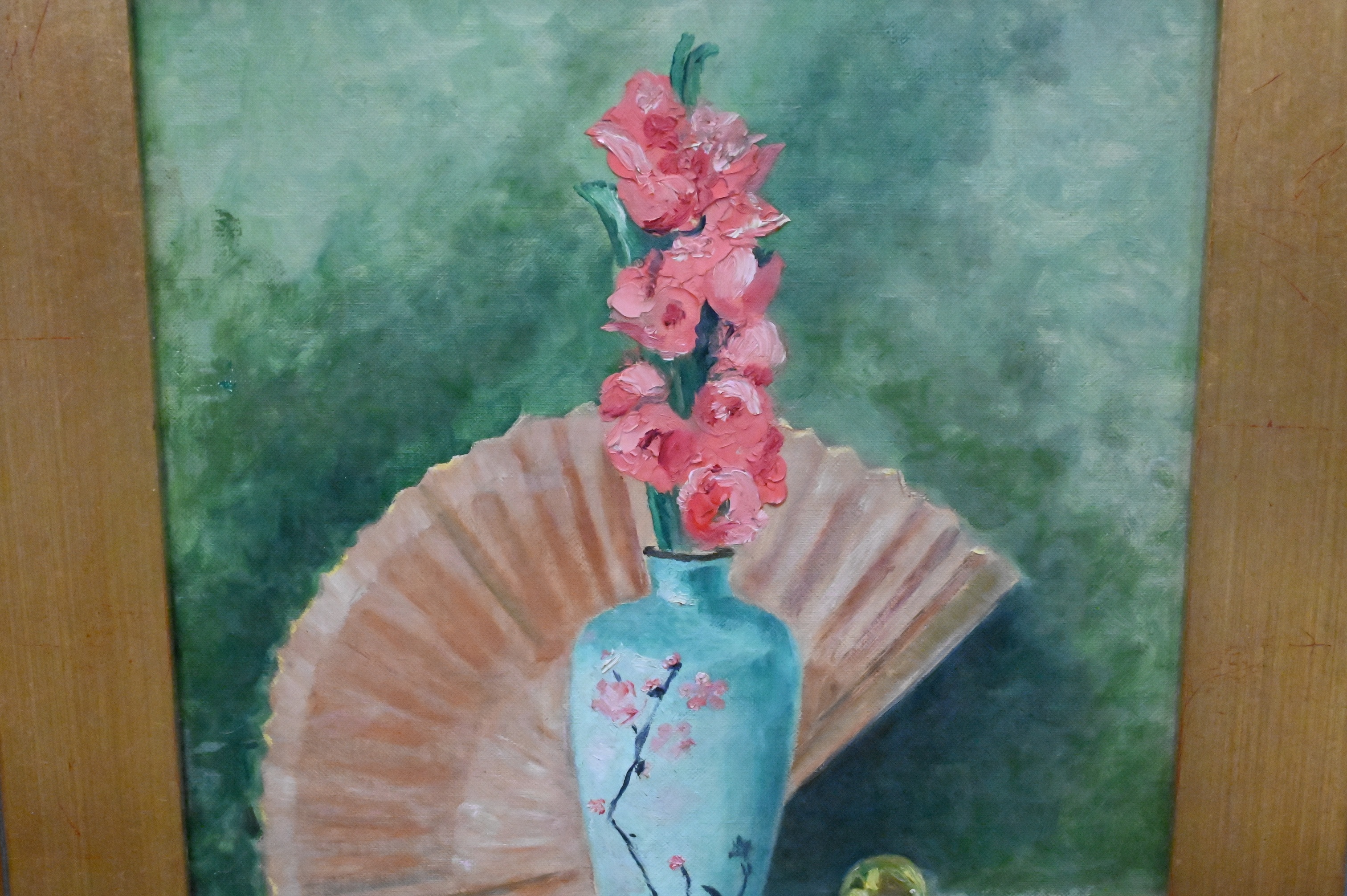 Oriental Still Life with Fan and Flowers in Turquoise Vase