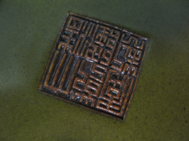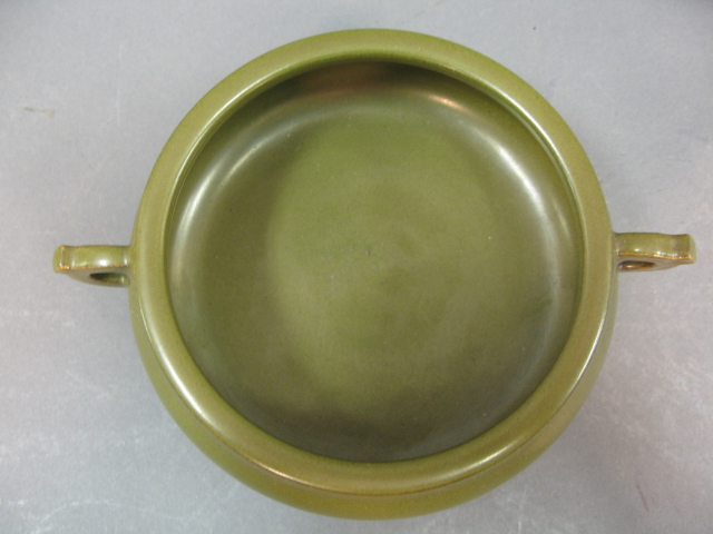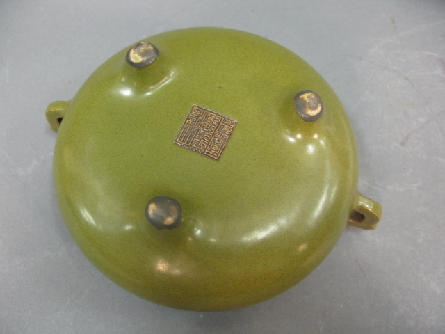 Oriental green glazed incense burner having molded handles and three footed base with seal mark on bottom.