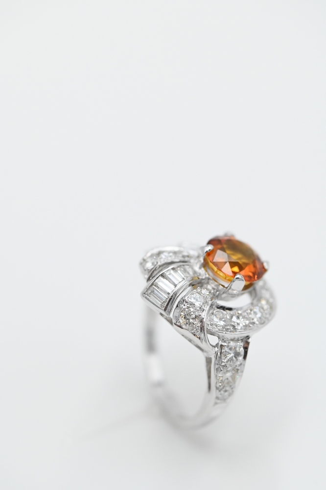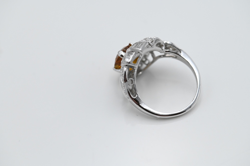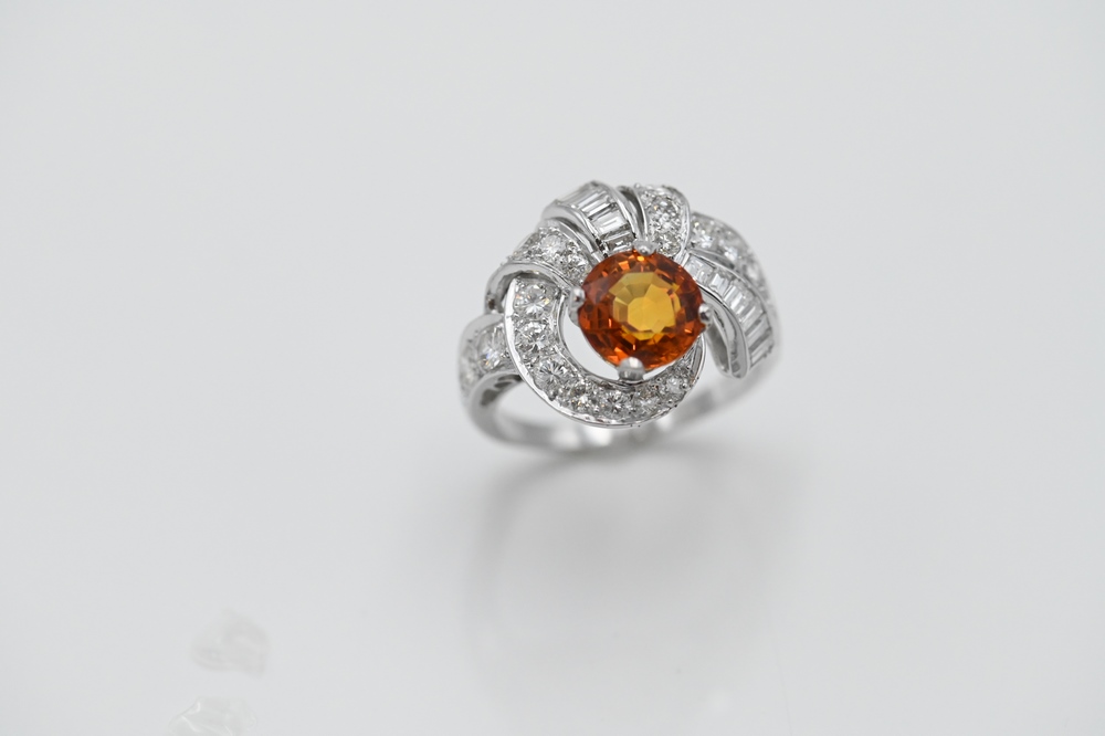 Lot 109: Platinum Ring, set with golden yellow sapphire, round and baguette diamonds, sapphire is 3 carats, 31 diamonds, total 1.25 carats, a…