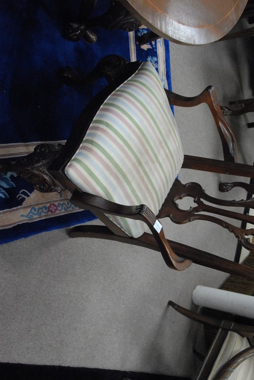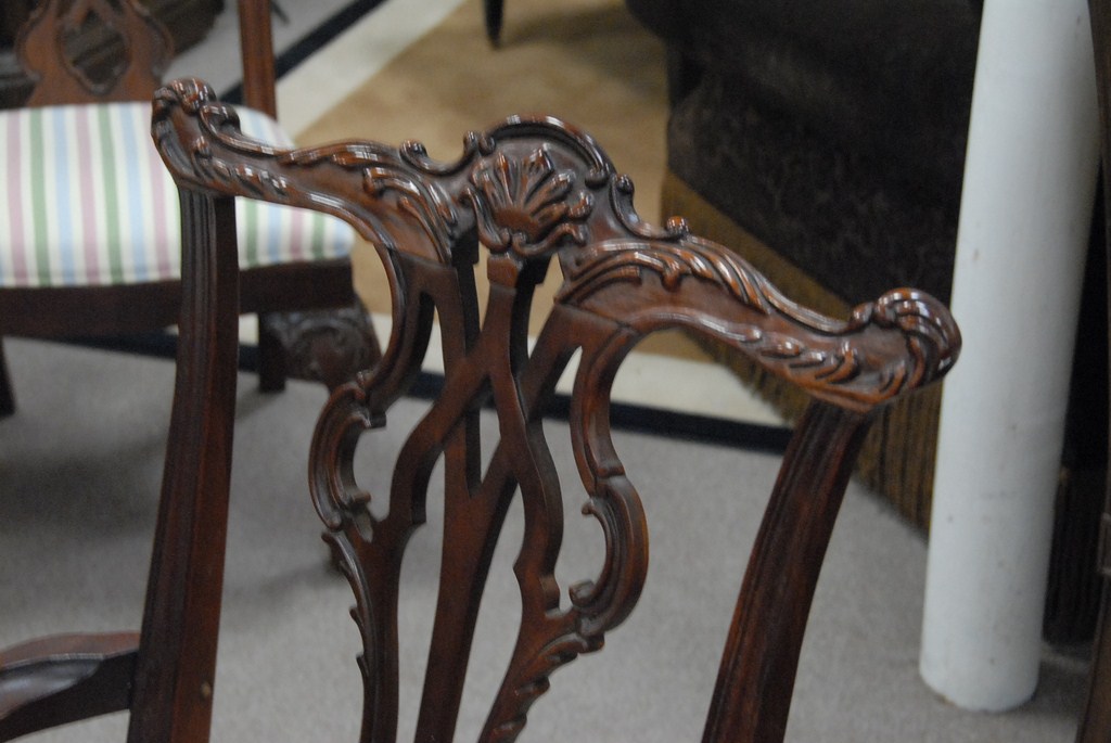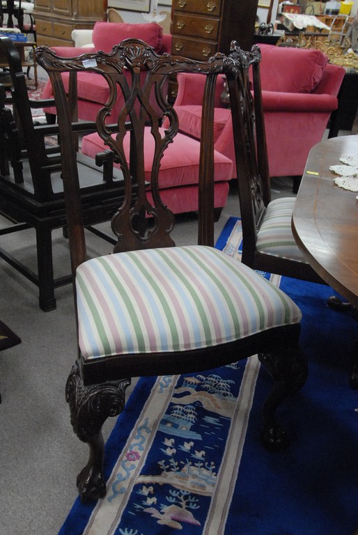 Lot 109: Set of seven Chippendale style mahogany dining chairs, one arm and six side signed Thomasville with ball and claw feet.