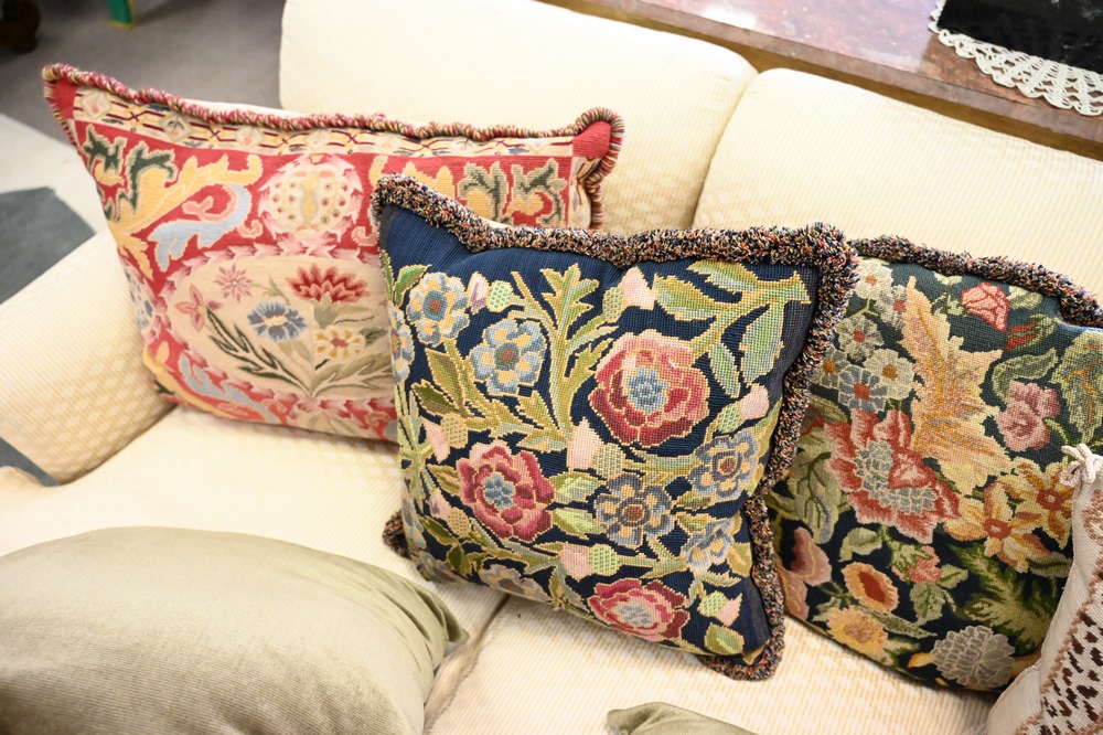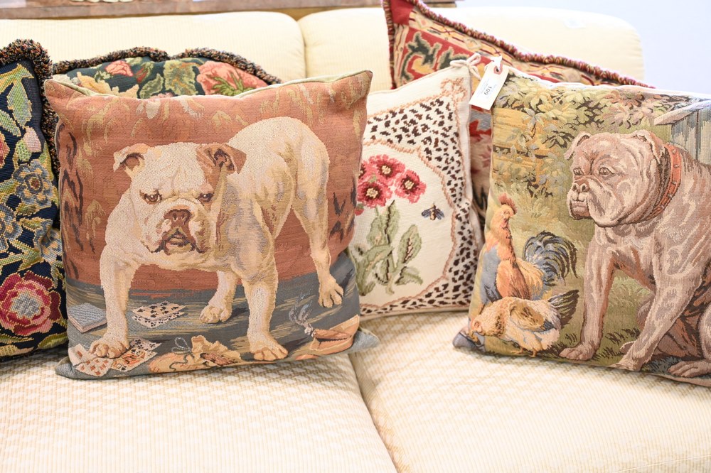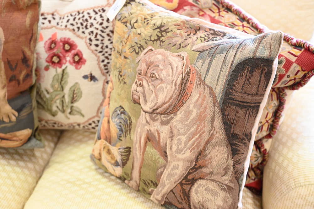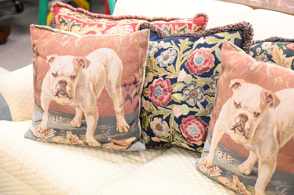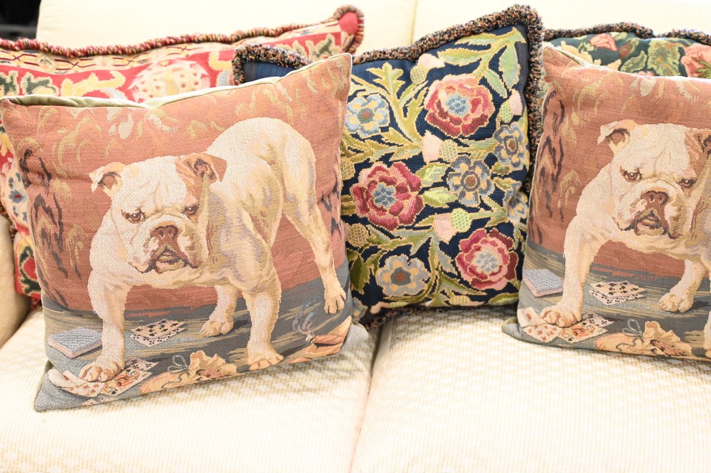 Lot 109: Seven Piece Pillow Lot, to include a pair of needlepoint and petit point red floral pillows, a pair of needlepoint pillows, along with three throw pillows having bulldogs, 15″ x 15″