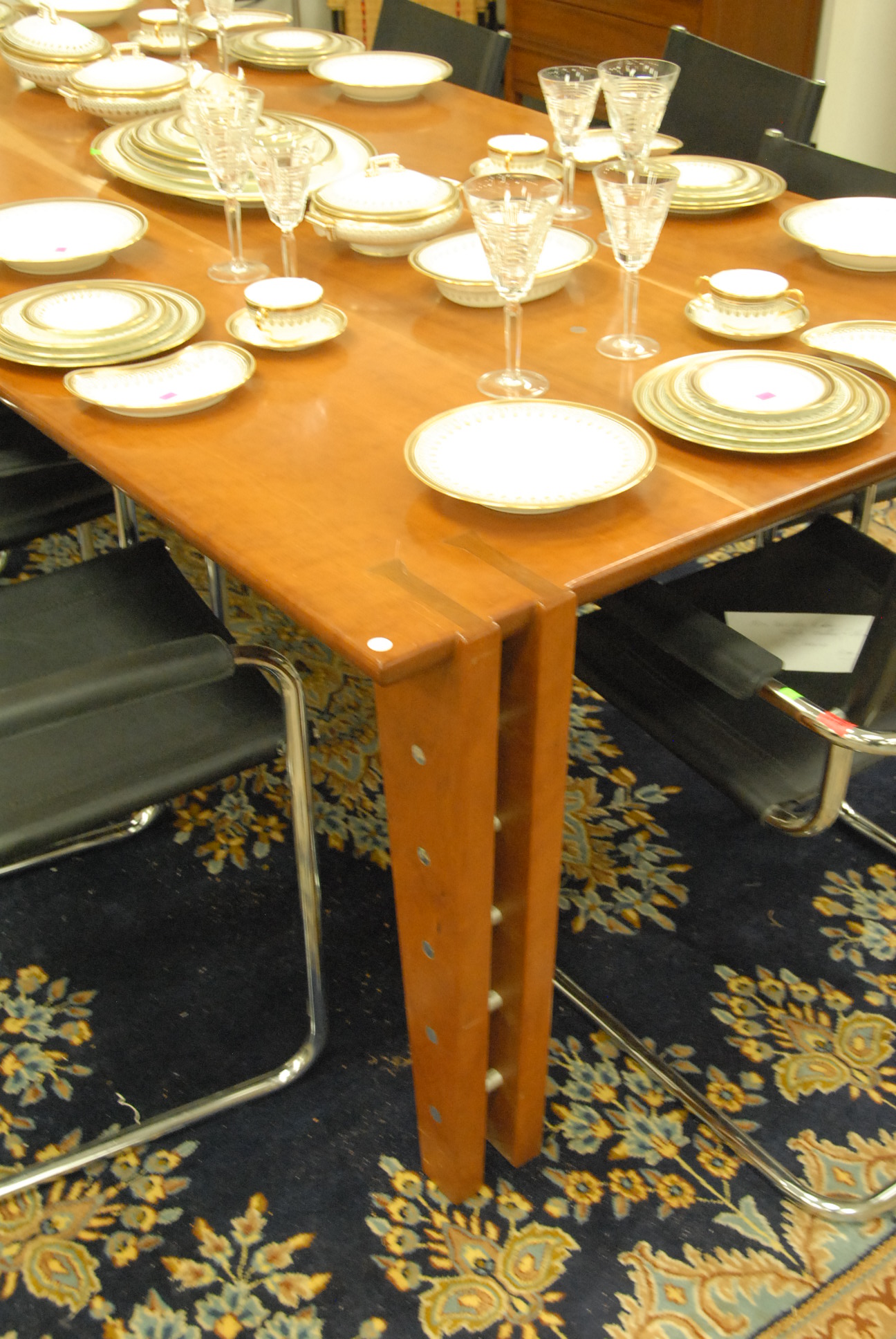 Studio Craft Movement custom dining table of solid cherry with aluminum accents with the top supported by four sets of parallel legs with aluminum spacers each leg set dovetailed in to the top at each corner, C.1990, ht. 29 1/2in. top: 48 x 96.