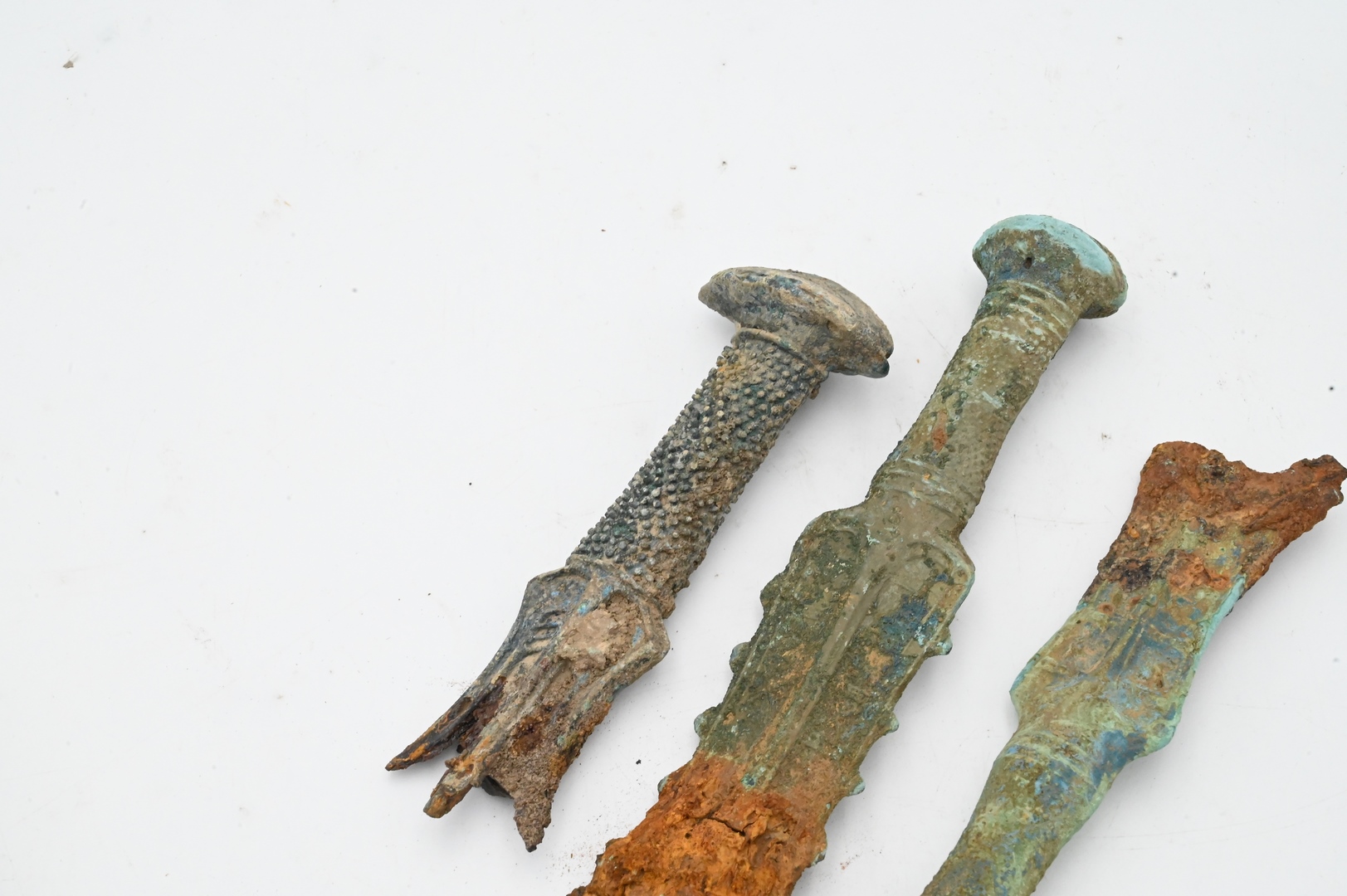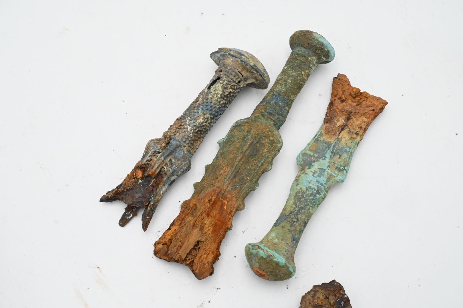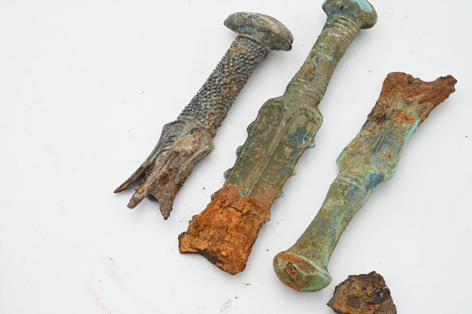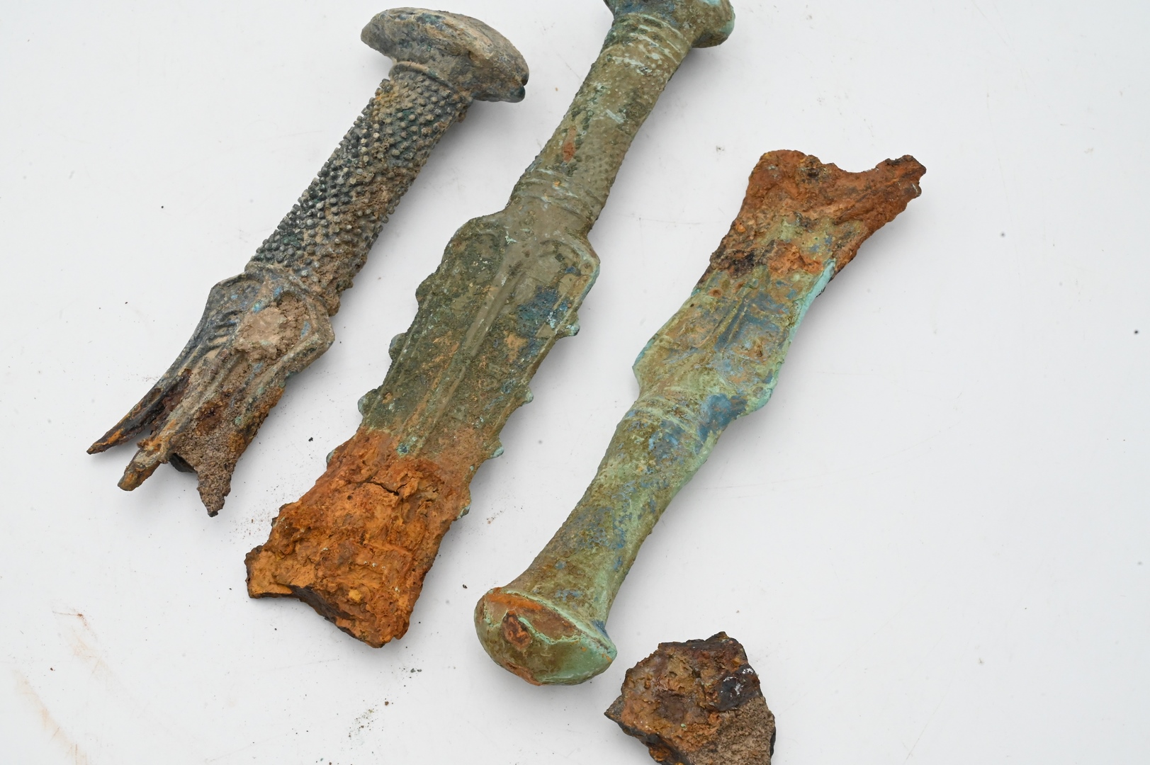 Three Bronze Ancient Sword Handle Remnants, as is, lengths 6 1/2, 8 1/4, and 7 inches.