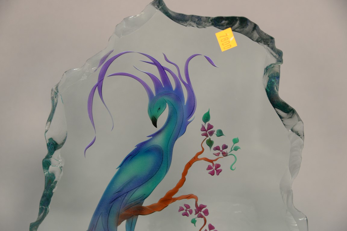 Lot 109: Three George Norboe cut etched glass sculptures, one of a phoenix bird on a branch signed Norboe and a pair of humming bird sculptur…