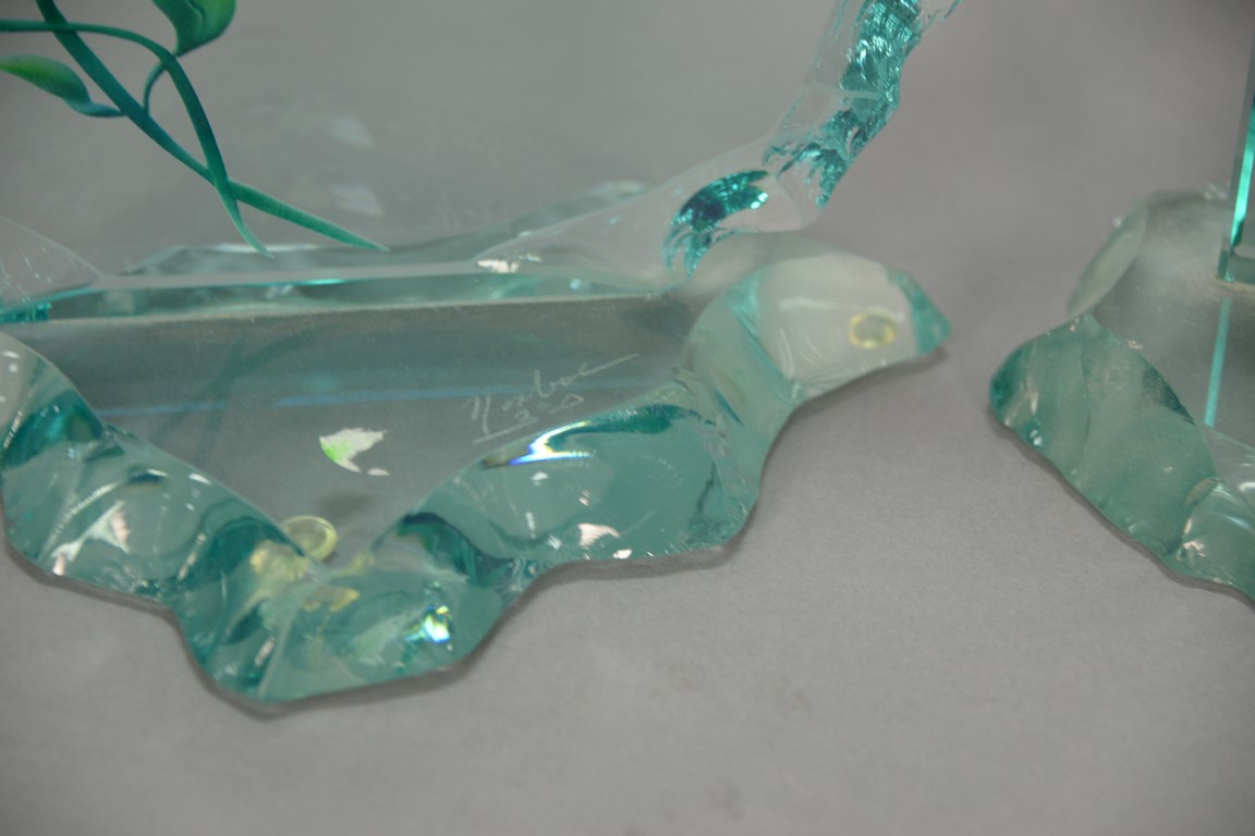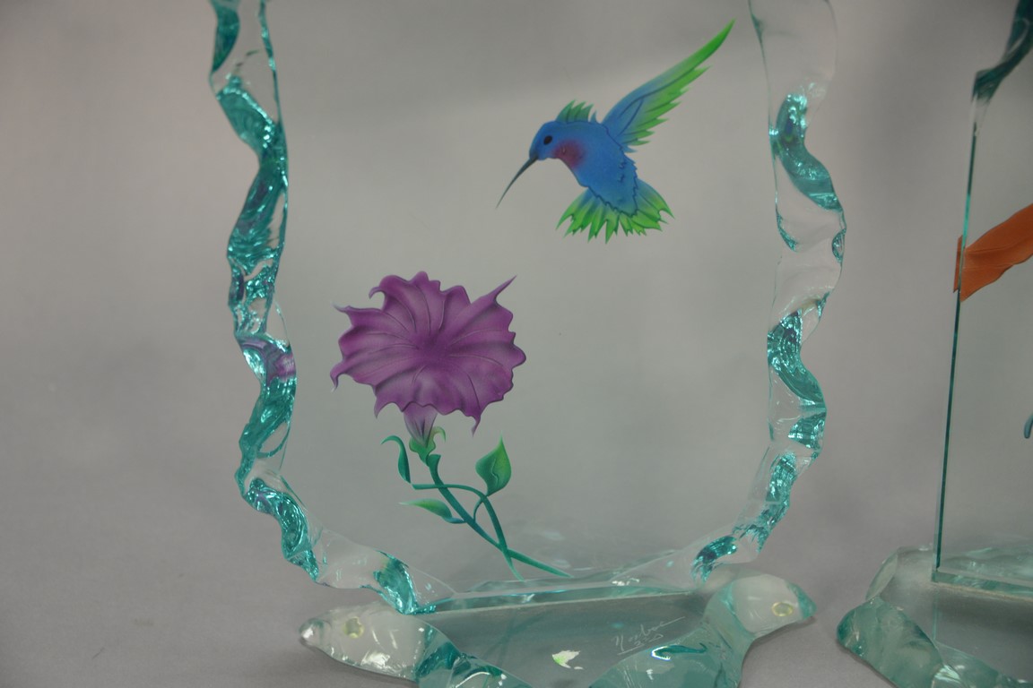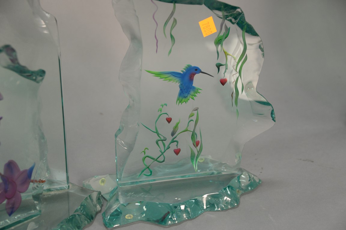 Three George Norboe cut etched glass sculptures, one of a phoenix bird on a branch signed Norboe and a pair of humming bird sculptures. ht. 11 in. wd. 9 1/2 in., ht. 13 in. wd. 8 in. & ht. 18 1/2 in. wd. 14 in.