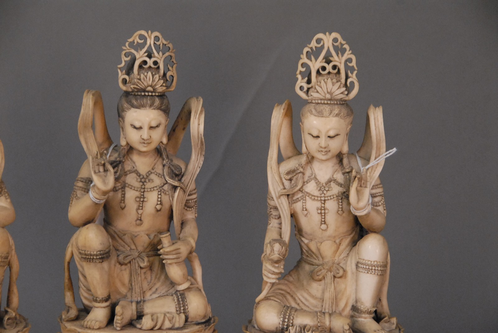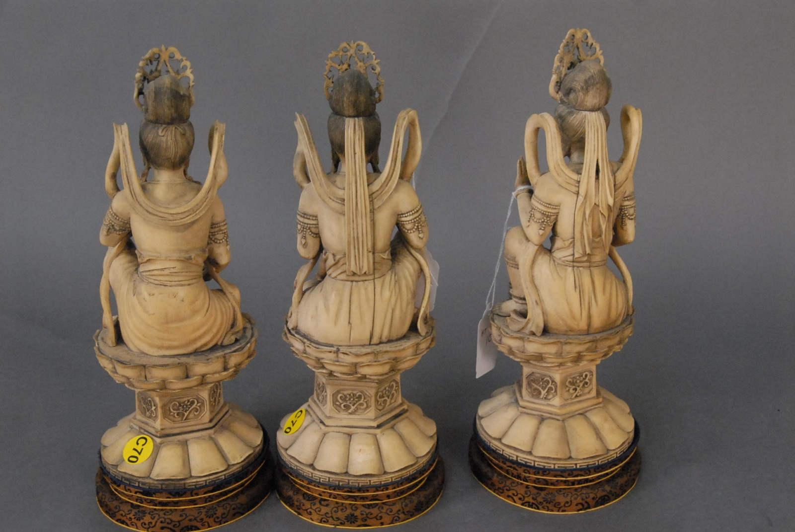 Trio of Chinese ivory Quan Yins, each seated in different poses on lotus bases, fitted cloth bases, 20th century.