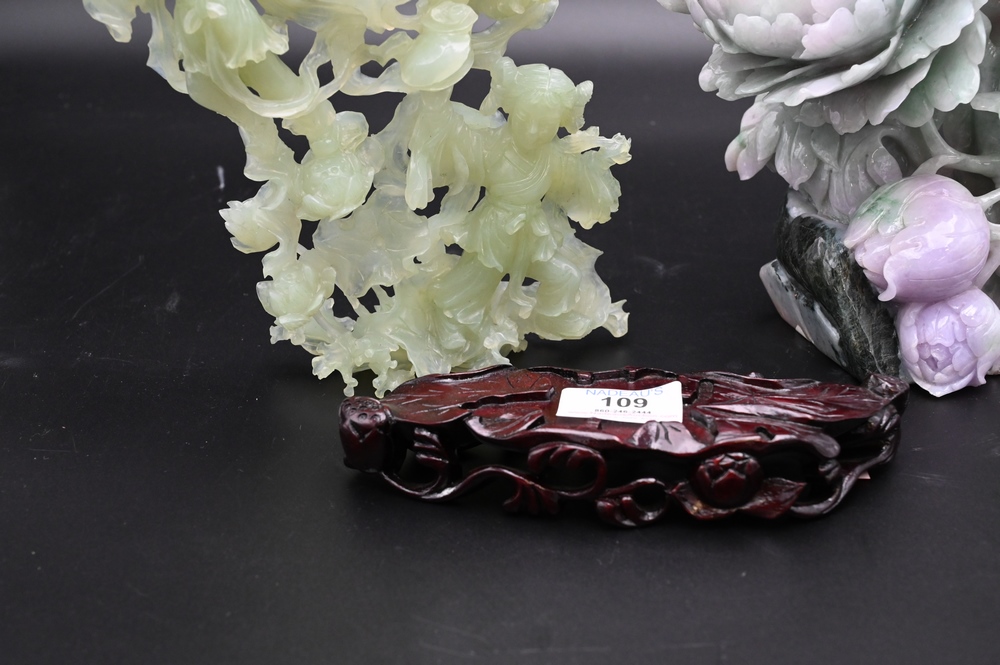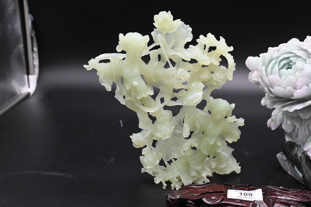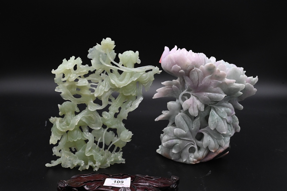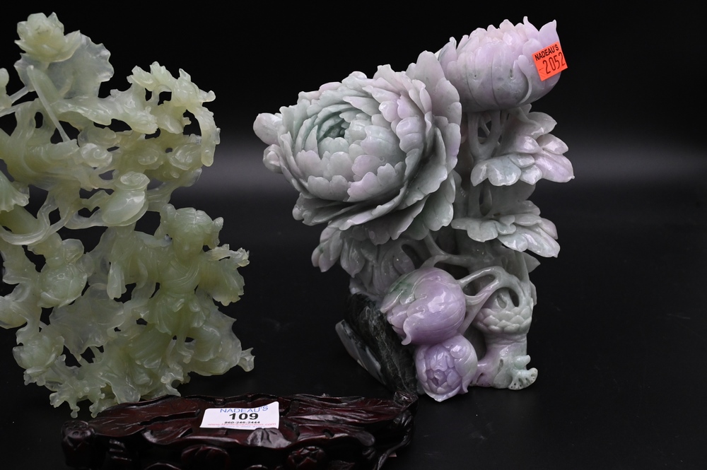 Lot 109: Two Carved Stone Chinese Pieces, jadeite lotus group with hues of purple and green along with a carved green figural group, 8 1/2 inches and 8 1/4 inches.