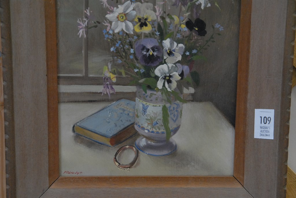 Lot 109: Two framed paintings to include Stuart Edson Eldredge 1902-1992 oil on masonite Bouquet with Bracelet slight lower left S. Eldre…