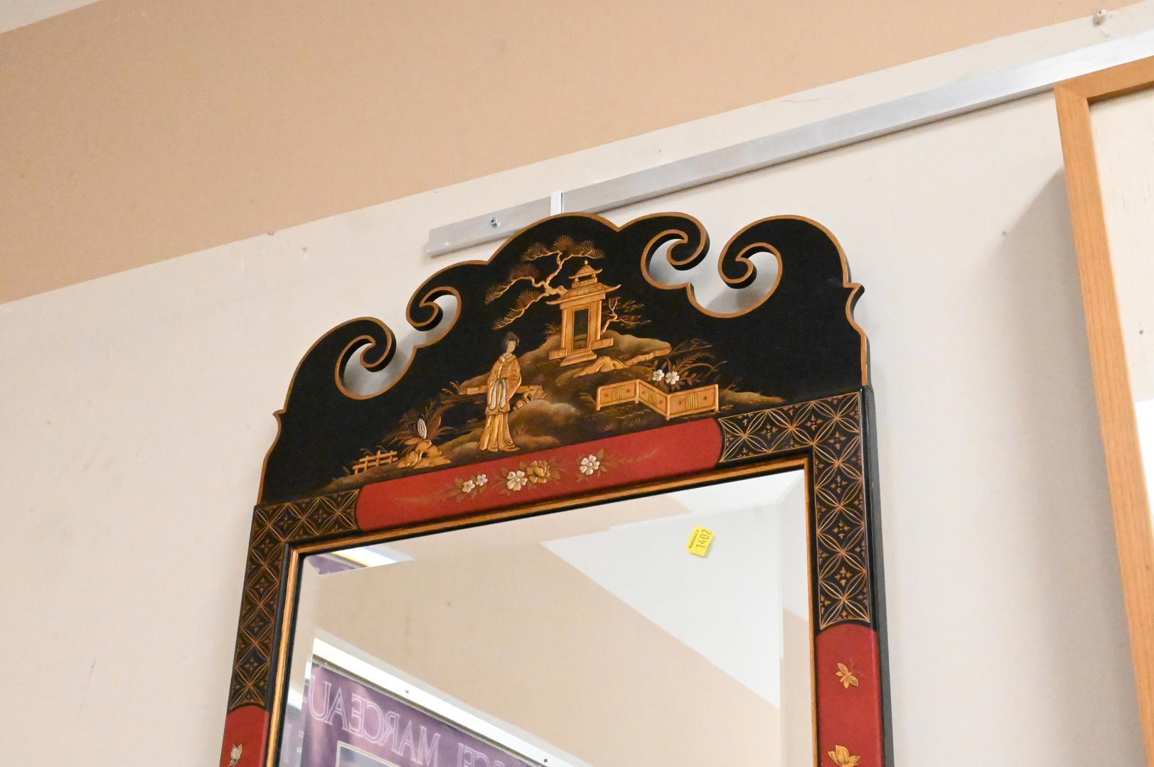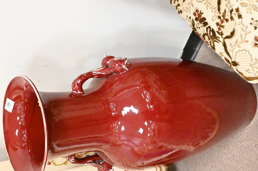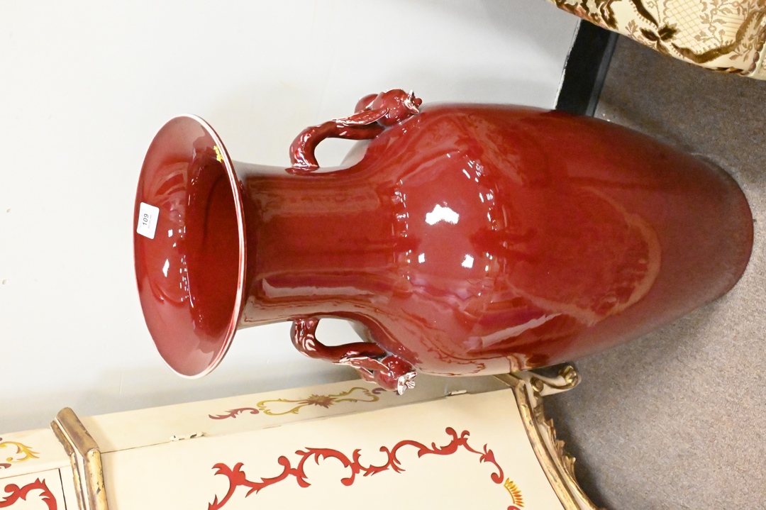 Two Piece Lot, to include a contemporary Chinese mirror having beveled glass, 48″ x 21 1/2″; along with a palace size Chinese vase, height 36 inches.
