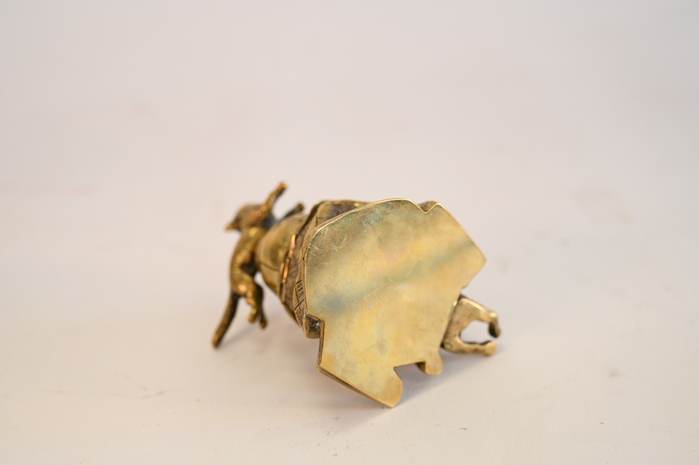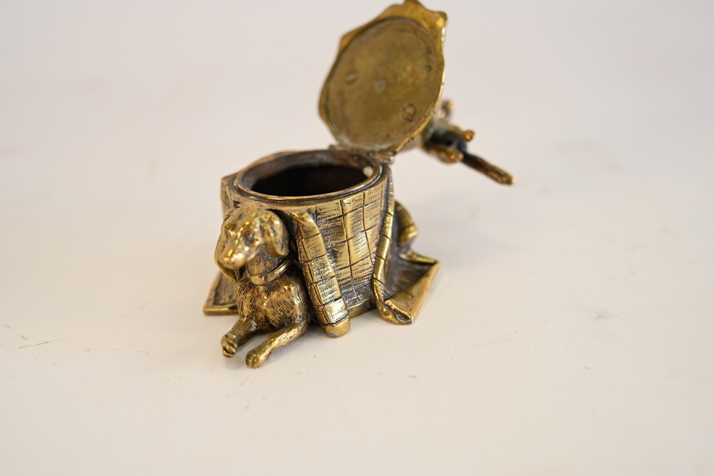 Brass Inkwell, having fox jumping over a hat and a dog under a blanket, height 3 1/2 inches.