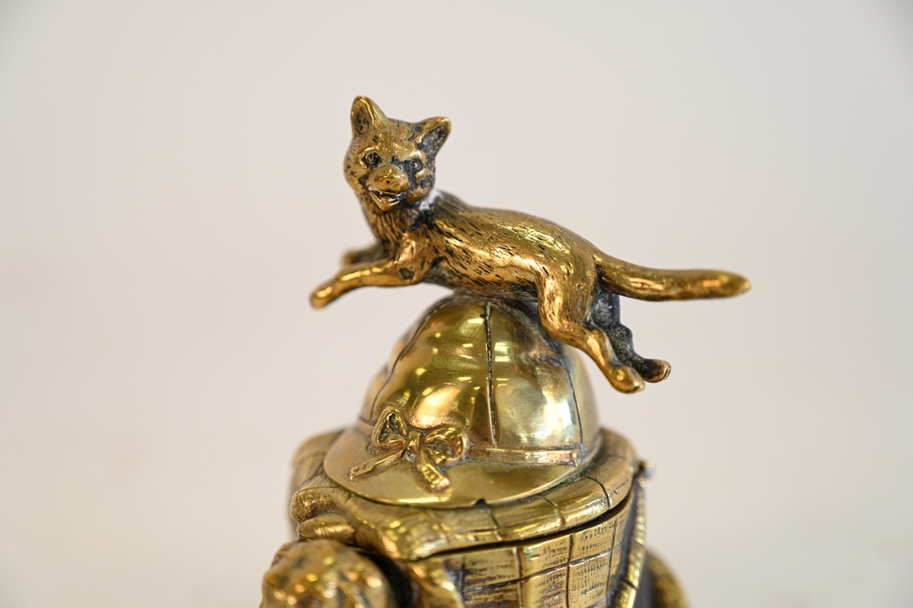 Lot 10A: Brass Inkwell, having fox jumping over a hat and a dog under a blanket, height 3 1/2 inches.