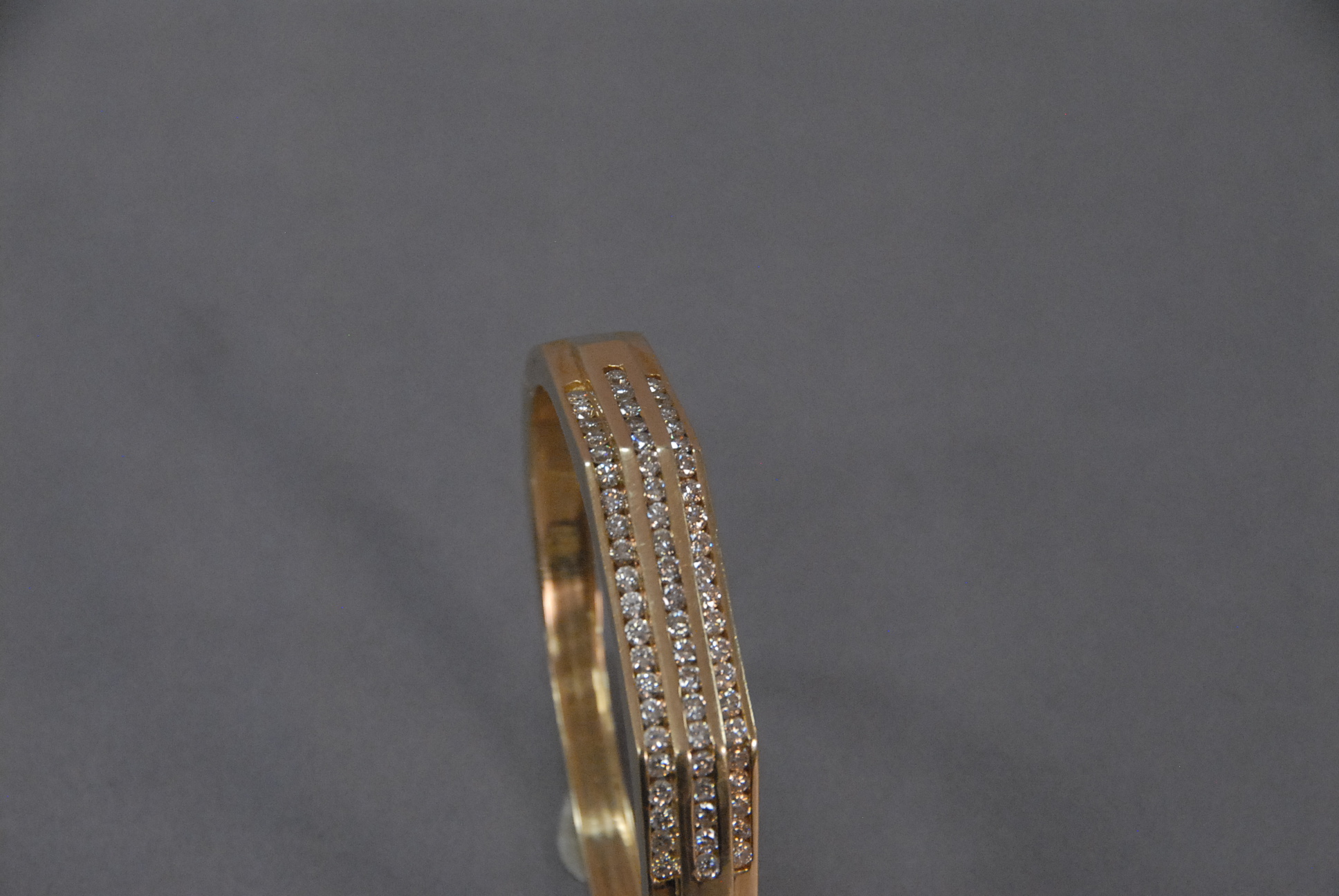 14K gold bangle bracelet set with three rows of twenty one diamonds, sixty three diamonds total, 49 grams.