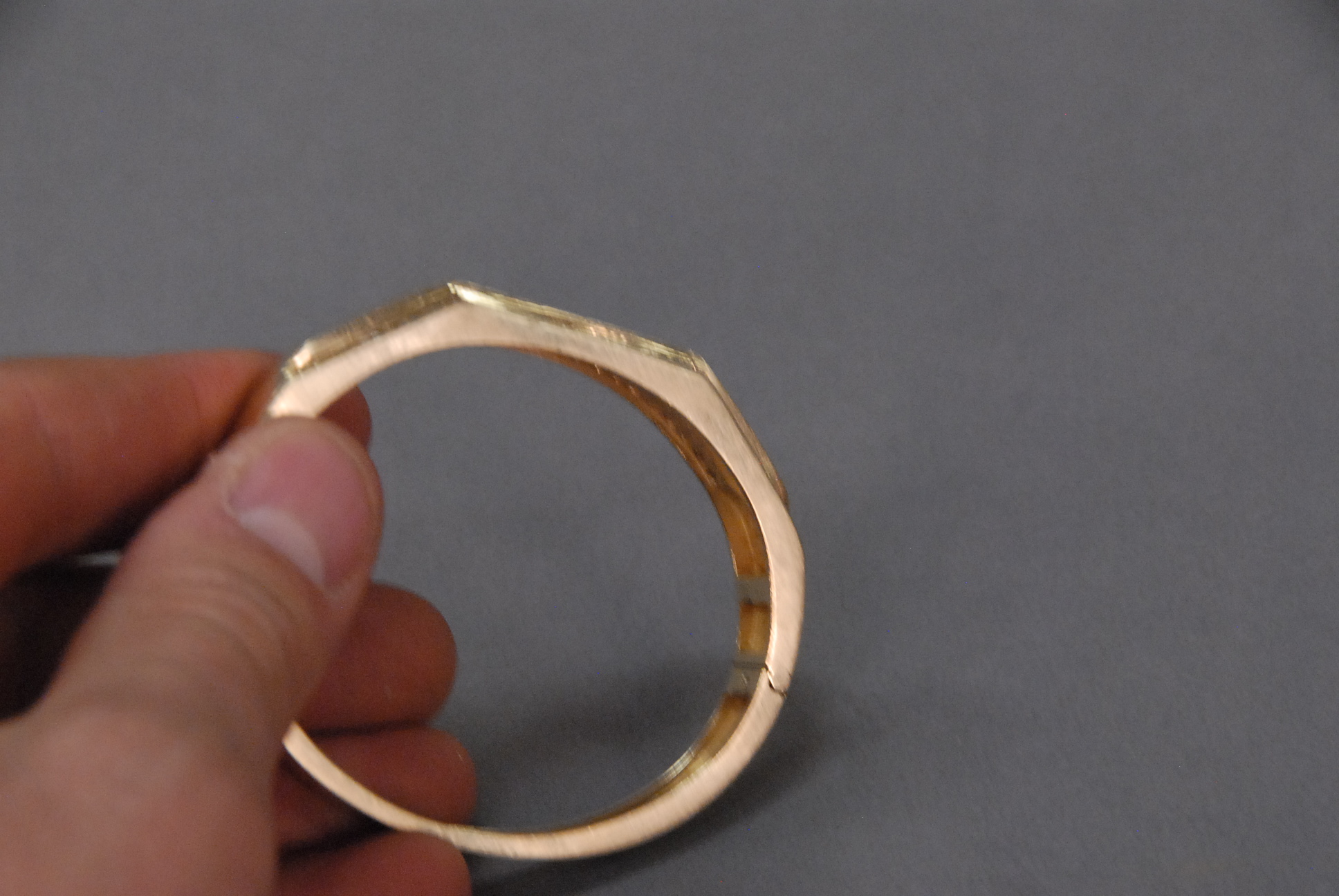 Lot 10O: 14K gold bangle bracelet set with three rows of twenty one diamonds, sixty three diamonds total, 49 grams.