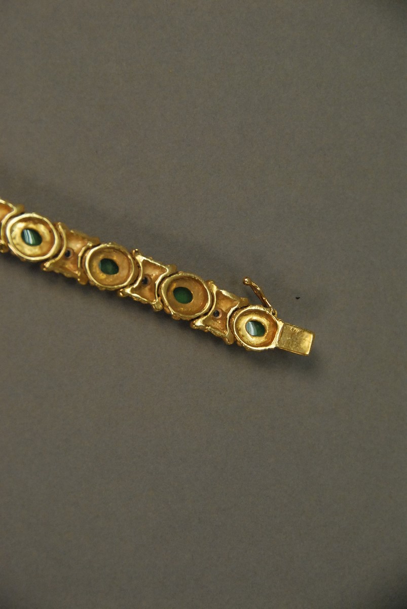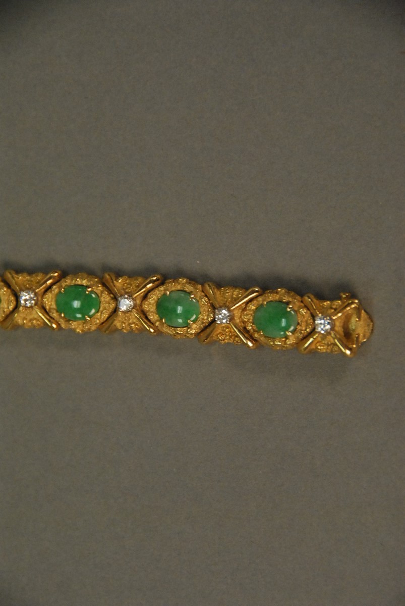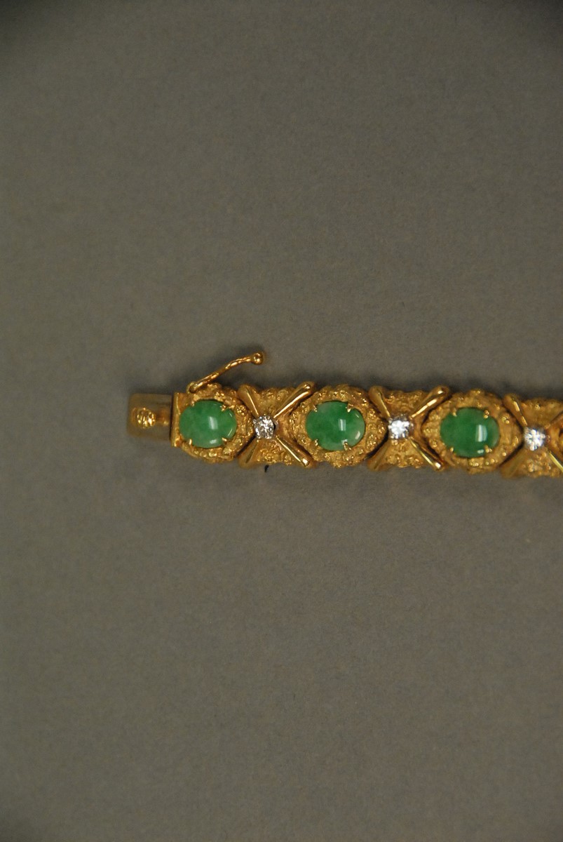 18K gold bracelet set with nine oval cut green jade stones and eight diamonds set in X’s. lg. 7 1/2 in. 54 grams Provenance: Property from a Private Collection Sold for the Benefit of the Virginia Historical Society.