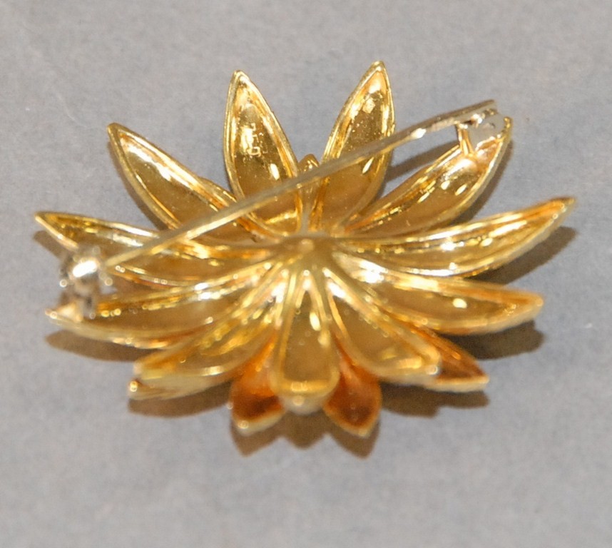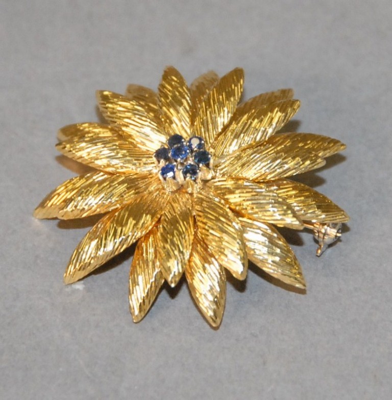 18kt gold sunburst pin with small blue stone. 15.2 grams