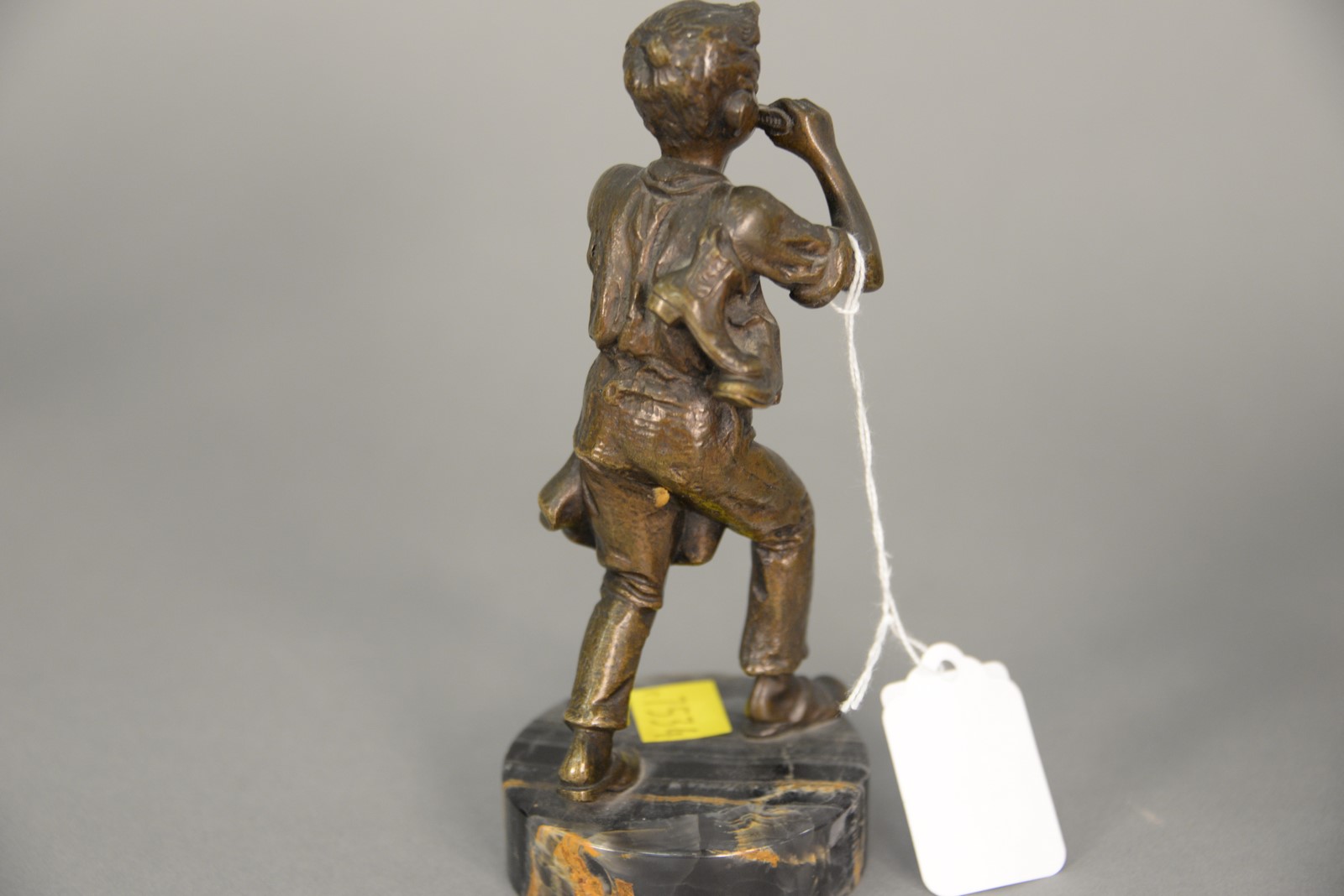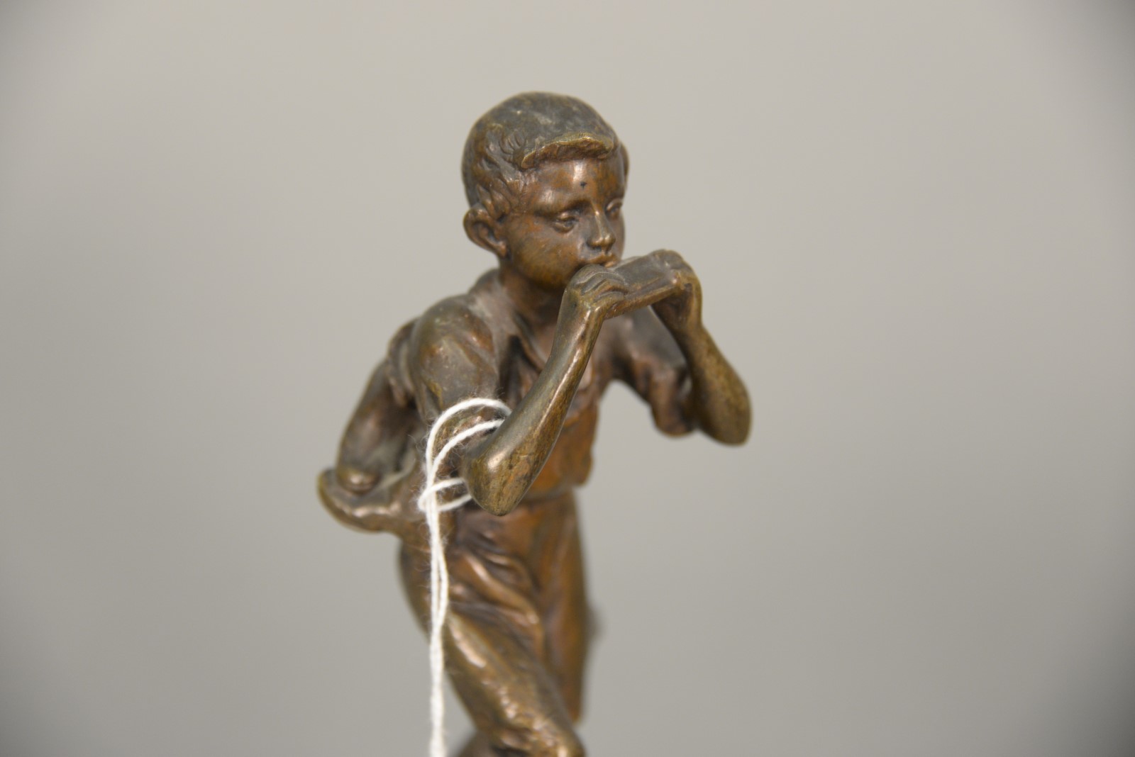 Bronze figure of boy playing harmonica on marble base. total ht. 6 1/4 in.