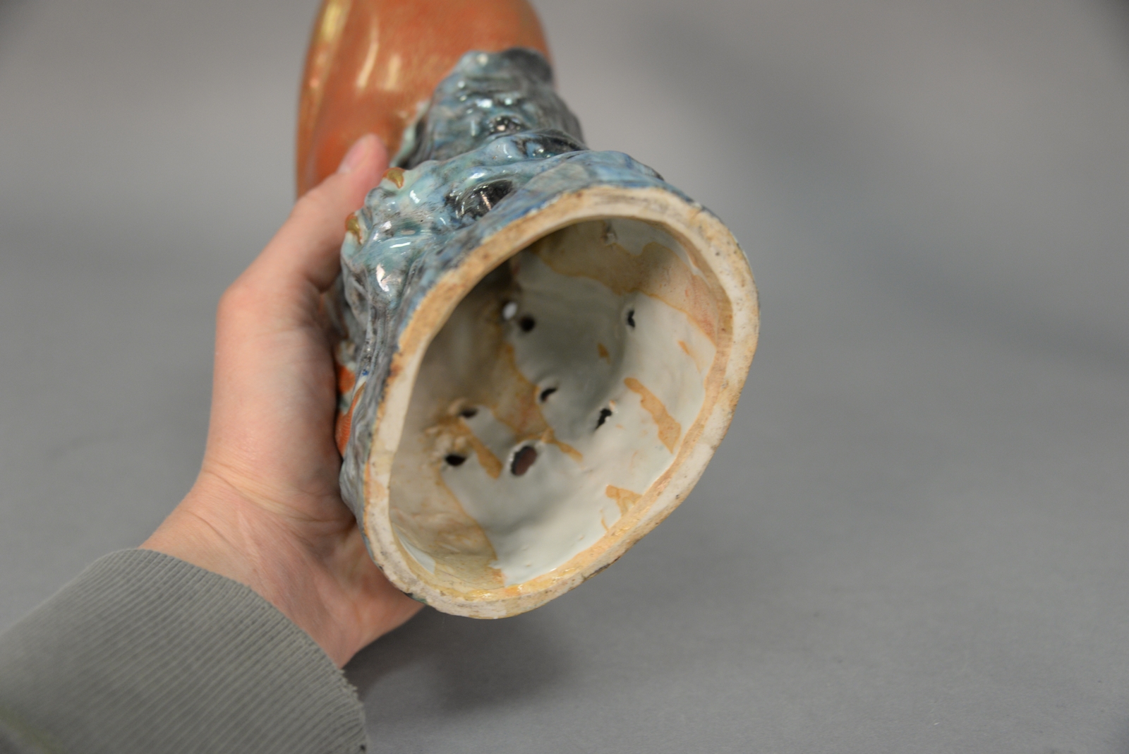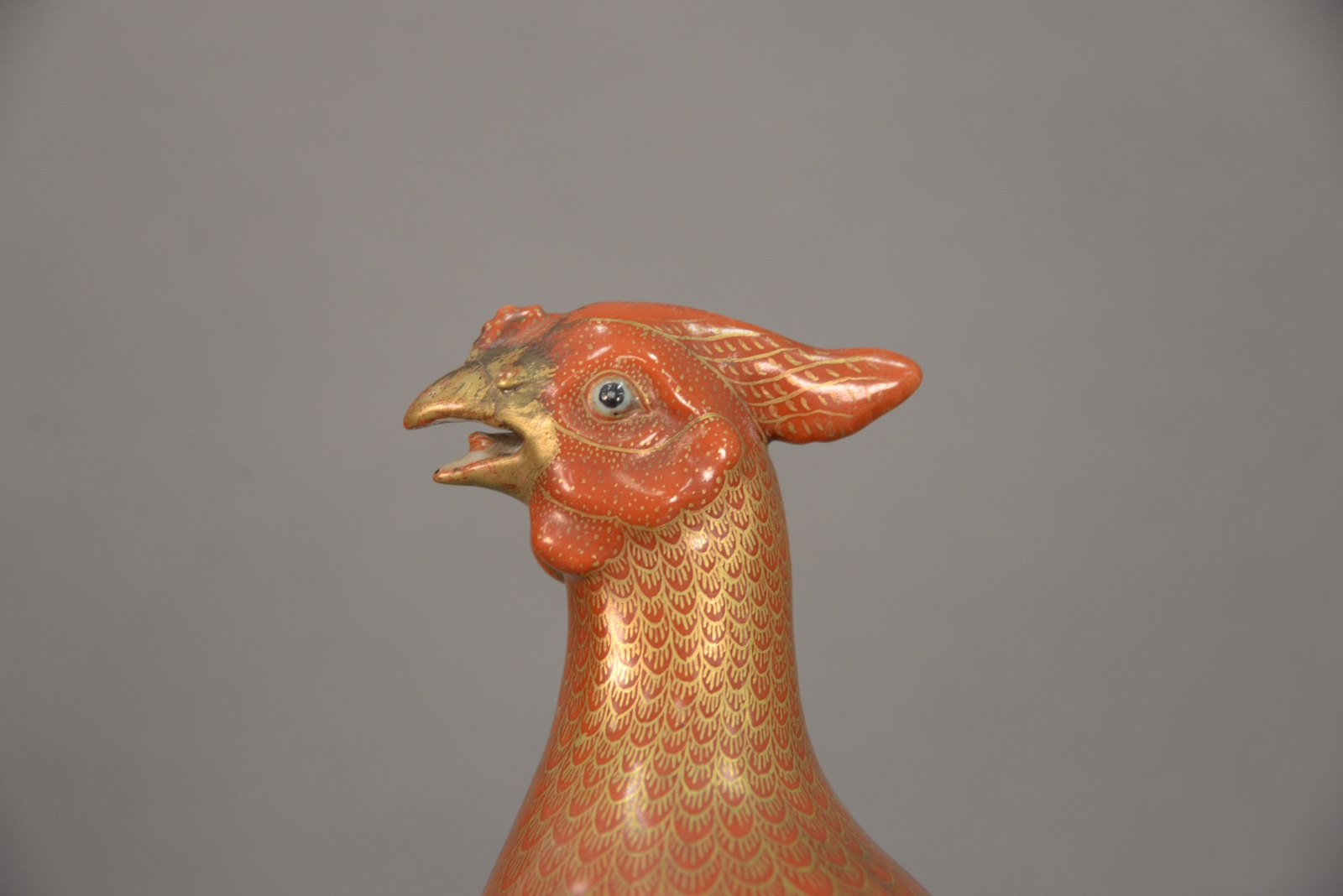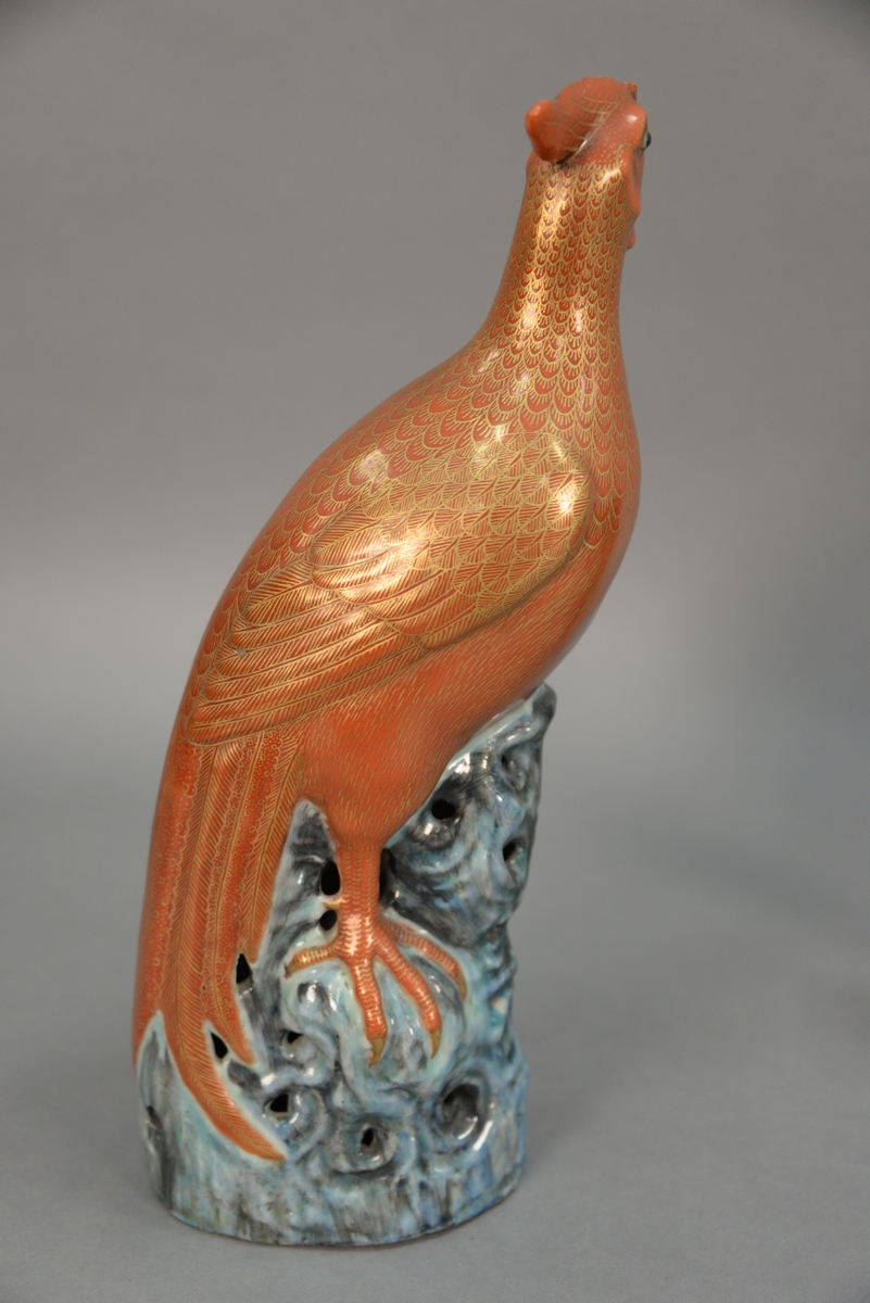 Lot 11: Chinese porcelain figural phoenix bird lantern standing on reticulated base. nose repaired, ht. 13 3/4in.