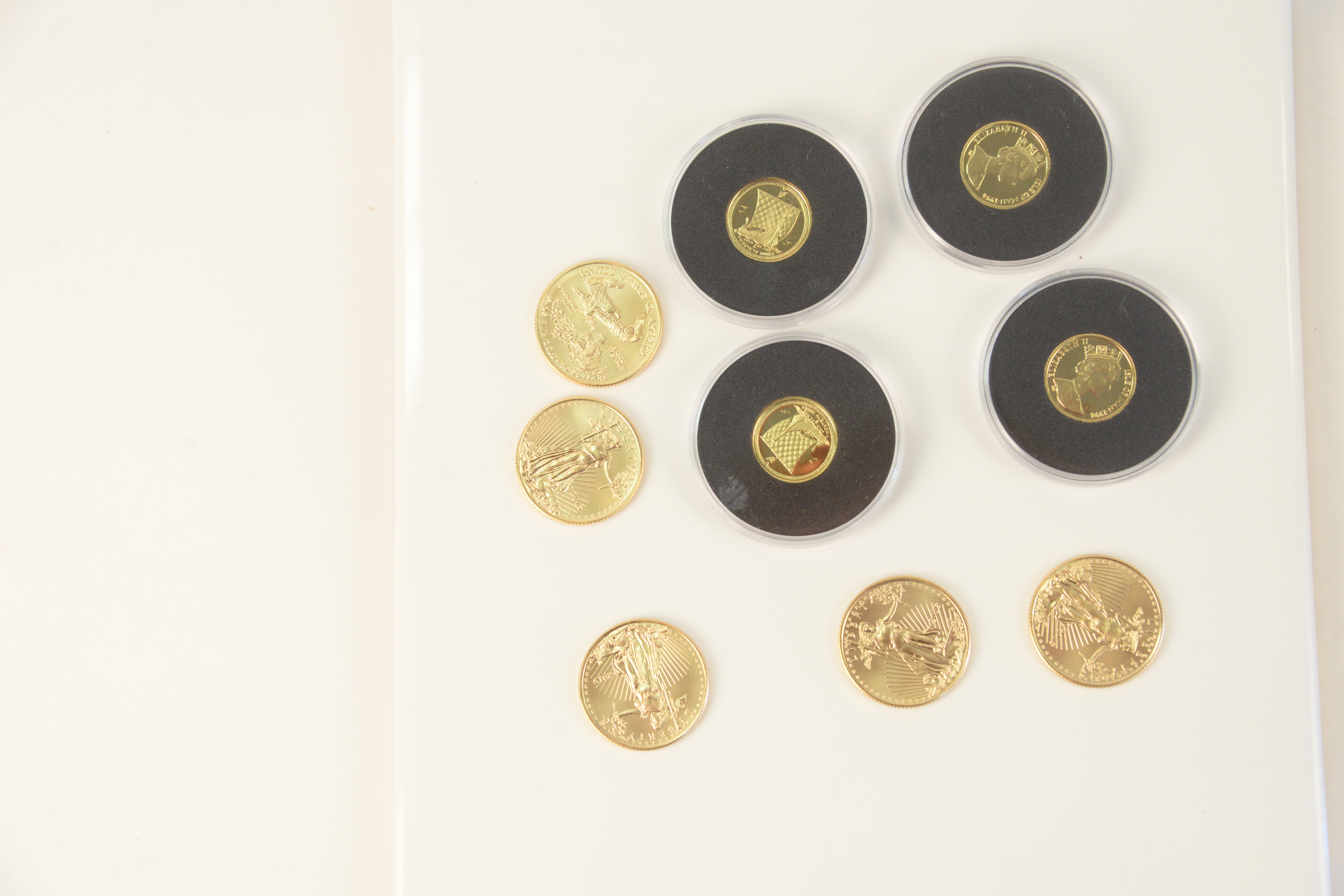 Five Gold Eagles, 1/4 oz. each, plus 4 Canadian 1/20 oz. gold.