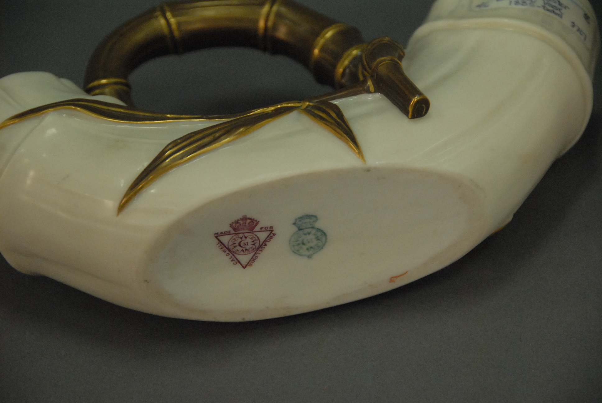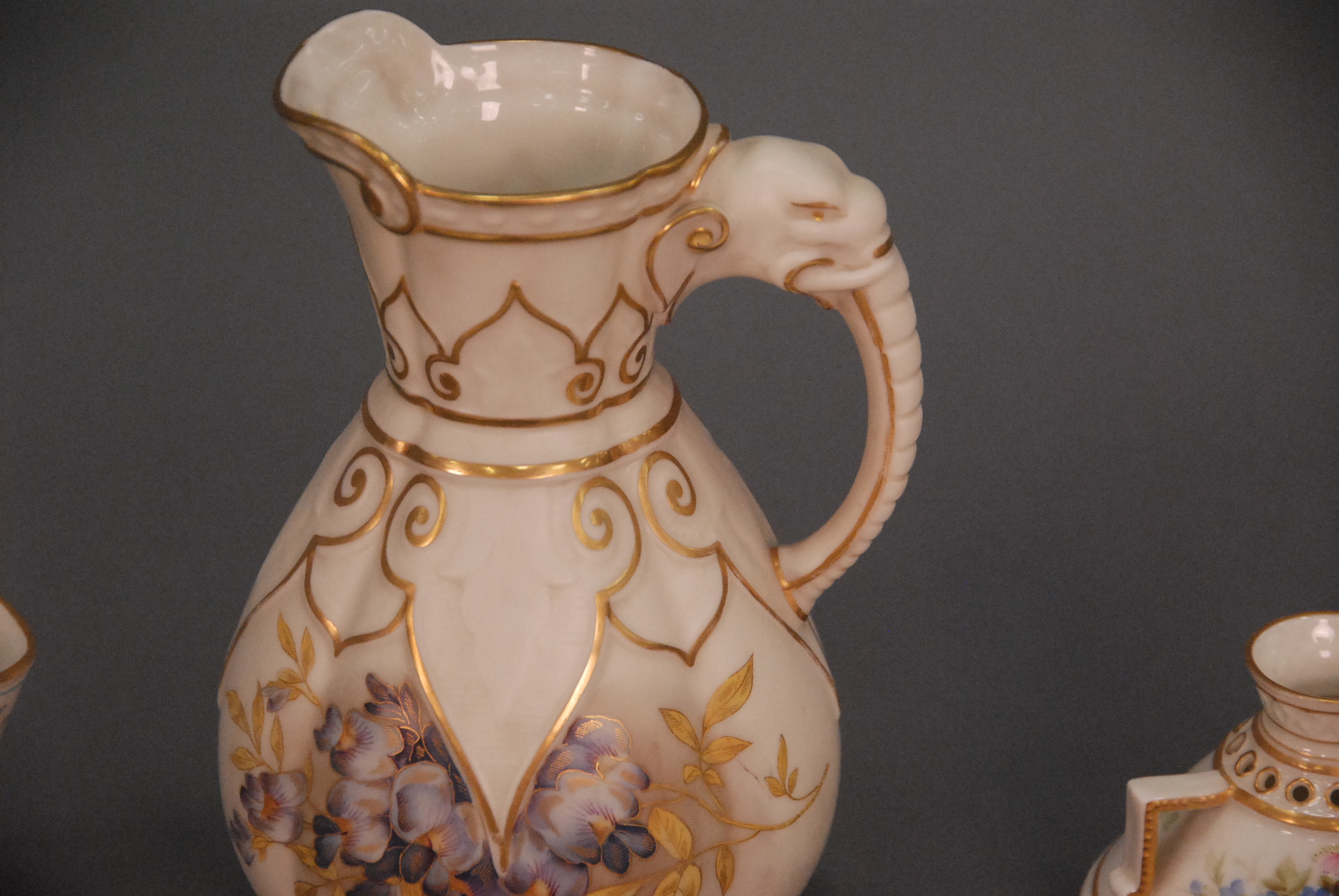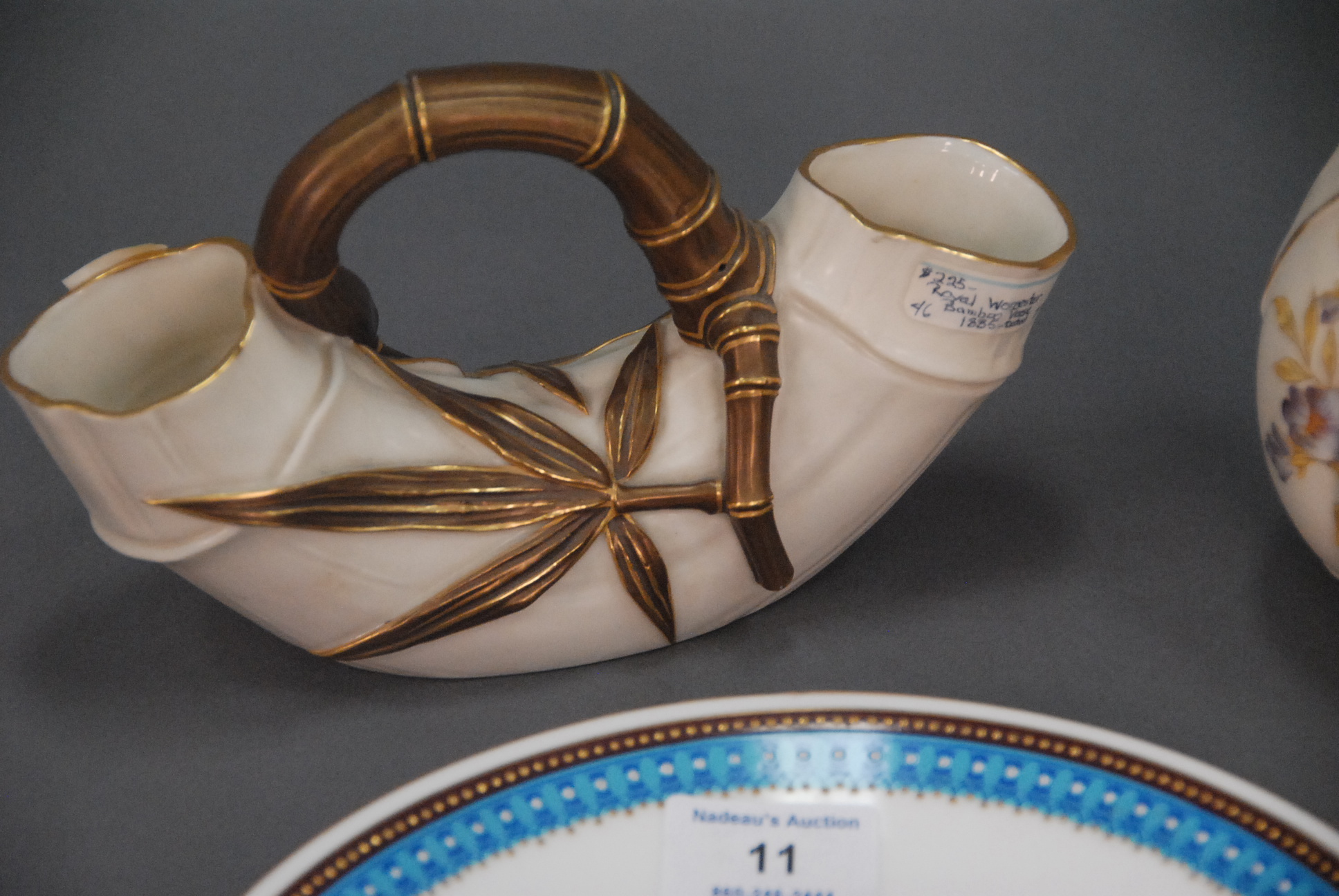 Five pieces or Royal Worcester pair of plates dia. 9, pitcher with elephant handle having purple mark, small bud vase having green mark, and bamboo vase having green mark ht. 8.