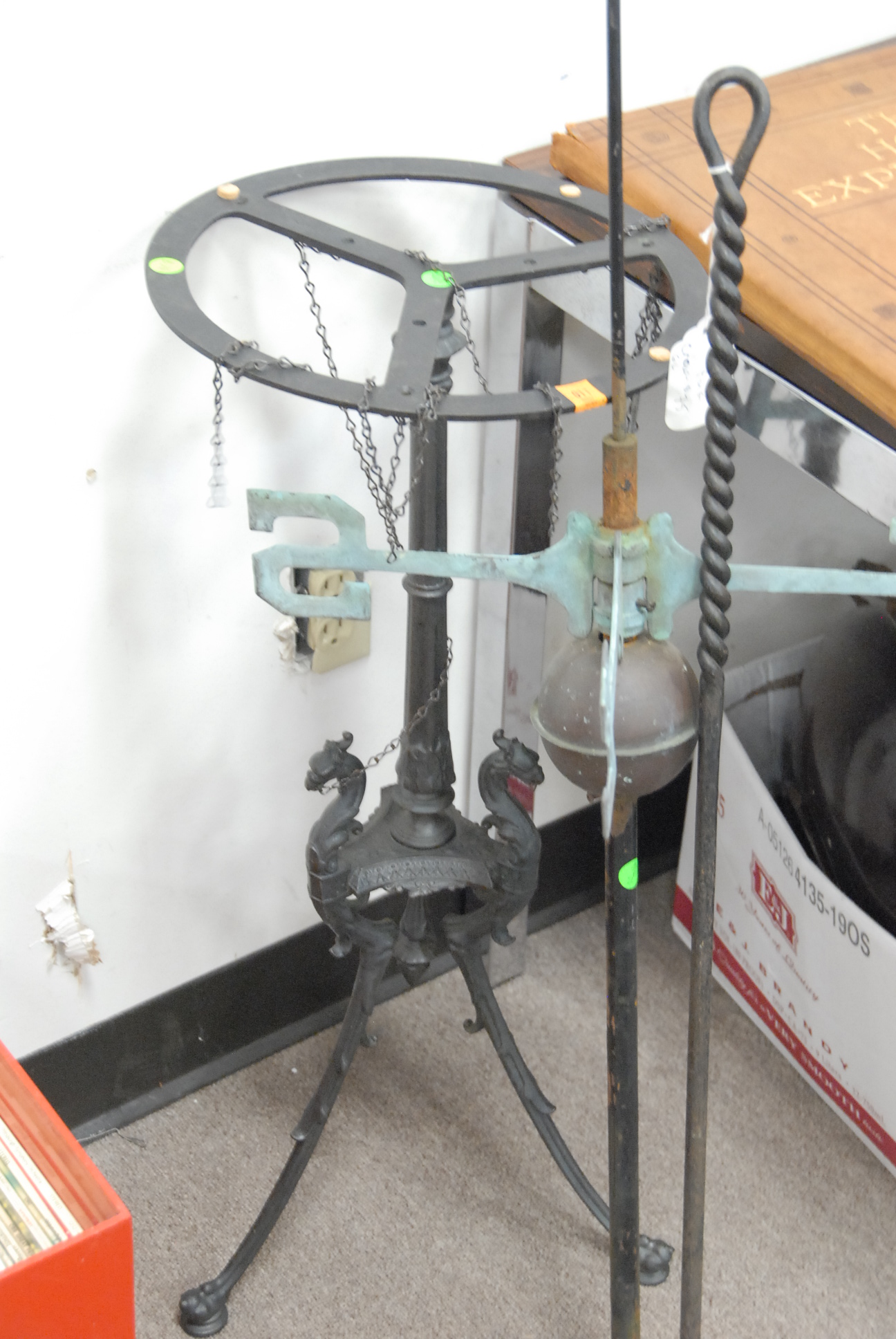 Group lot including a brass coal hod, a weathervane stand, iron fork, wooden bowl, crocks, and a maple dry sink.