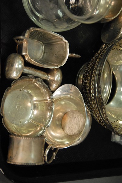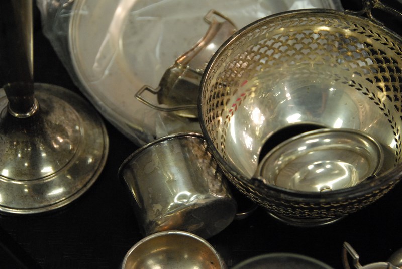 Lot 11: Group of sterling silver to include a weighted trumpet vase, baby rattle, open salts, napkin ring, small plate, etc., 14.4 weighable…