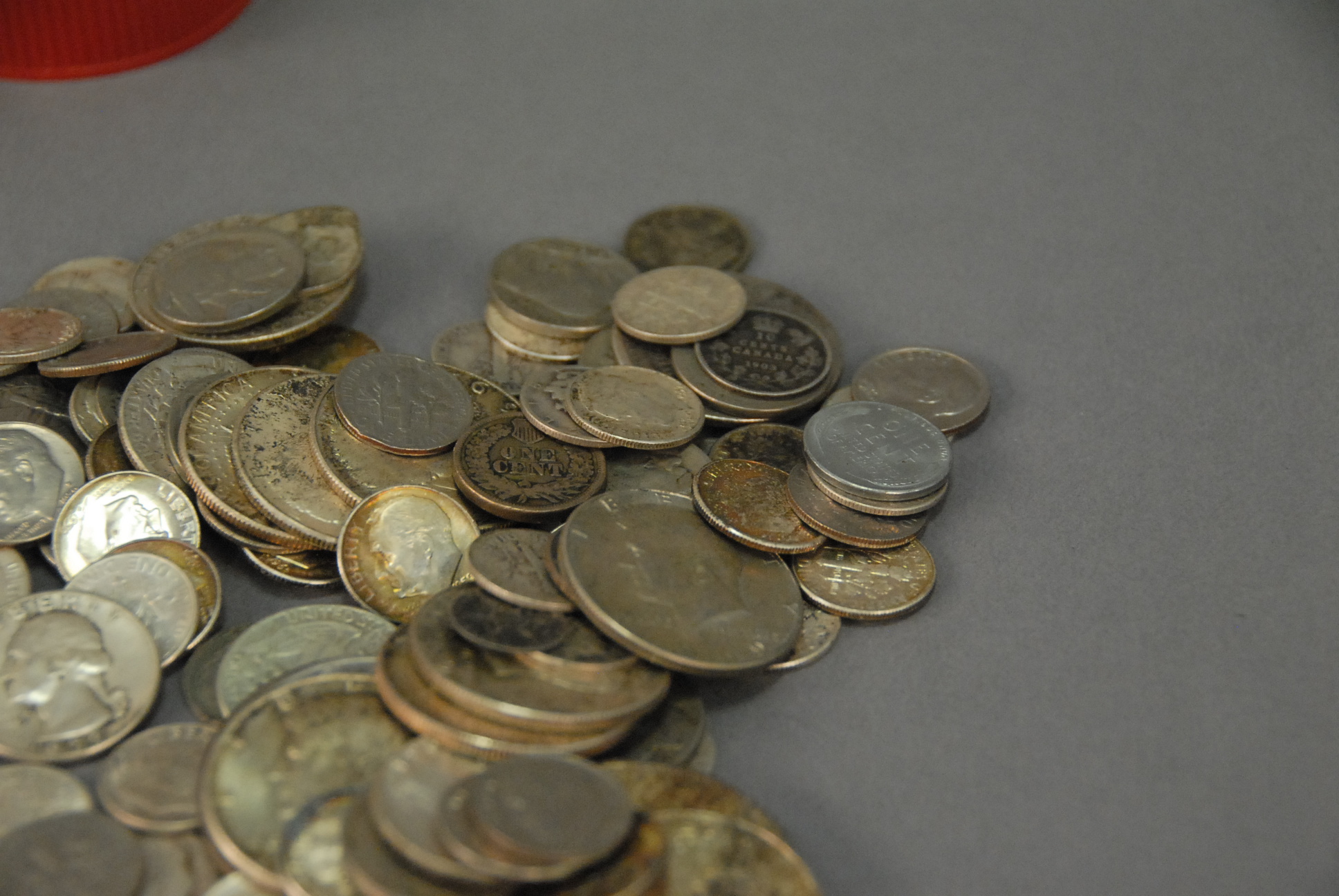 Jar of coins, mostly silver including silver dollars, half dollars, quarters, nickels, and dimes.