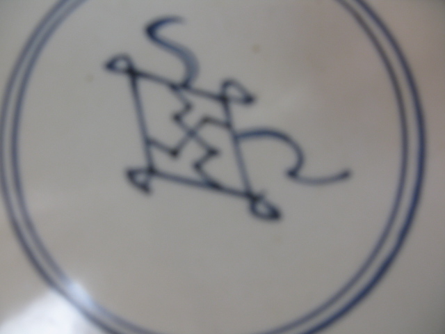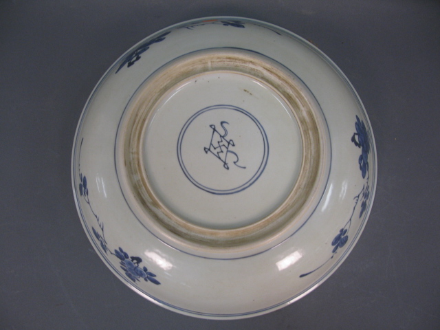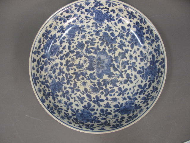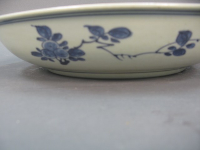 Large blue and white porcelain wild flower dish, having a deep cupped edge and wild flower decoration throughout.