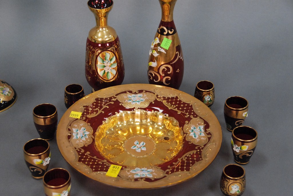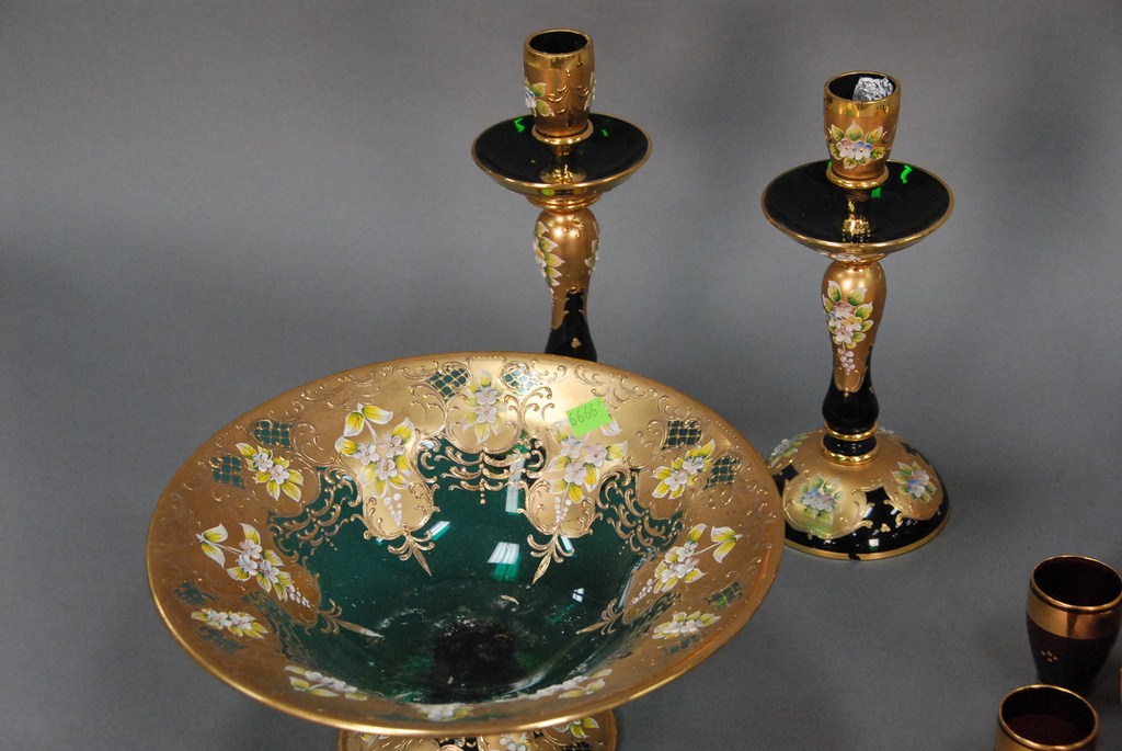 Lot 11: Large grouping of Murano glass, gold decorated to include two bowls, candle sticks, decanters, and cordial glasses in red and green.