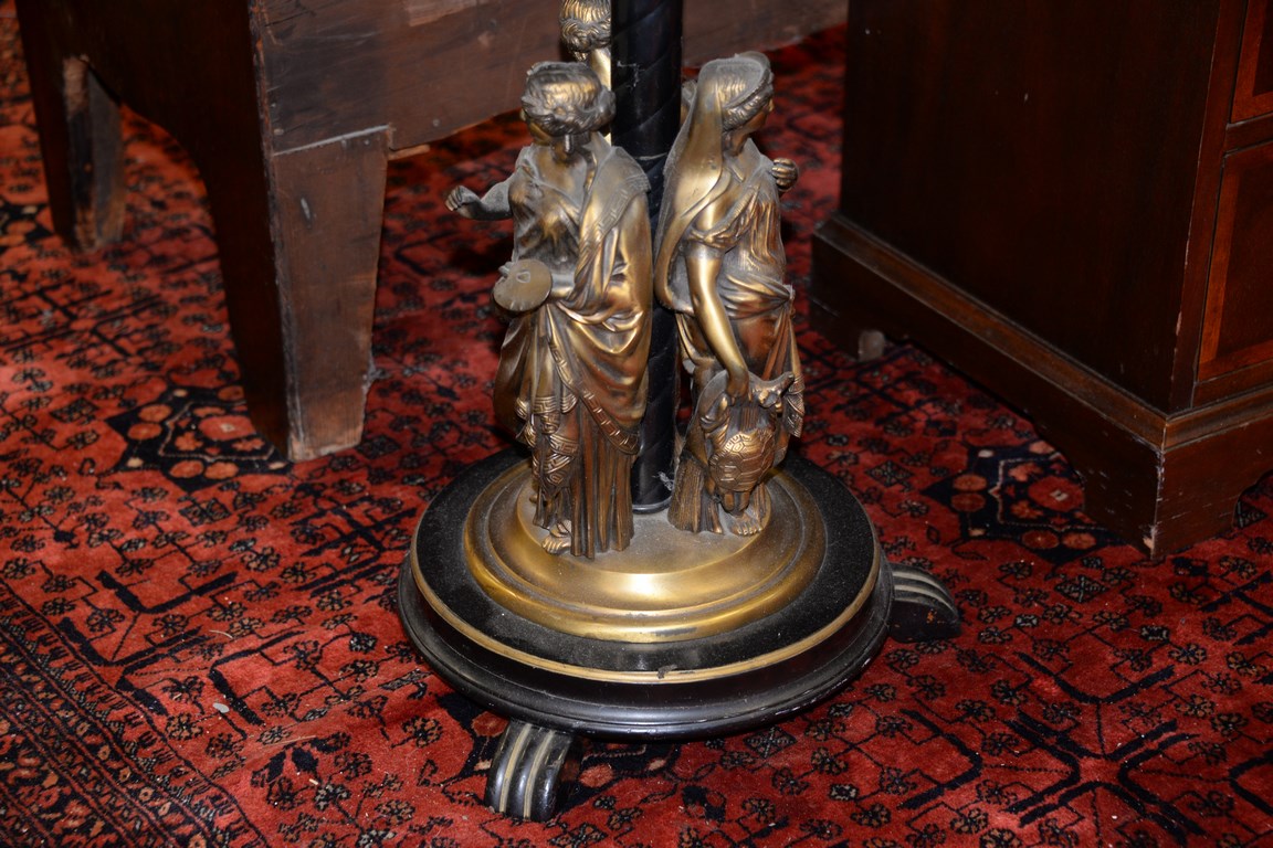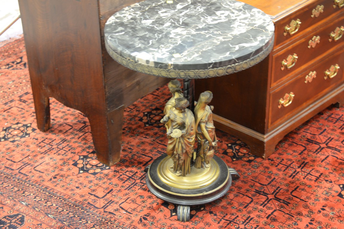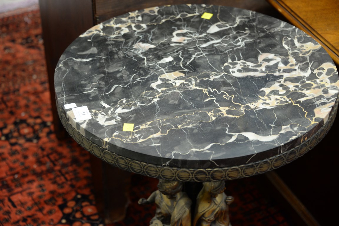 Marble top table with triple figure bronze base, ht. 24in., dia.20 in.