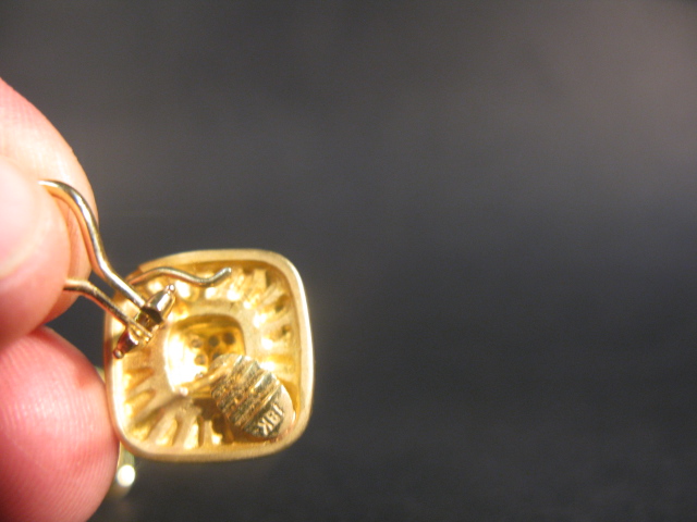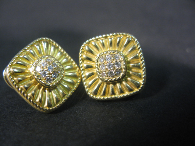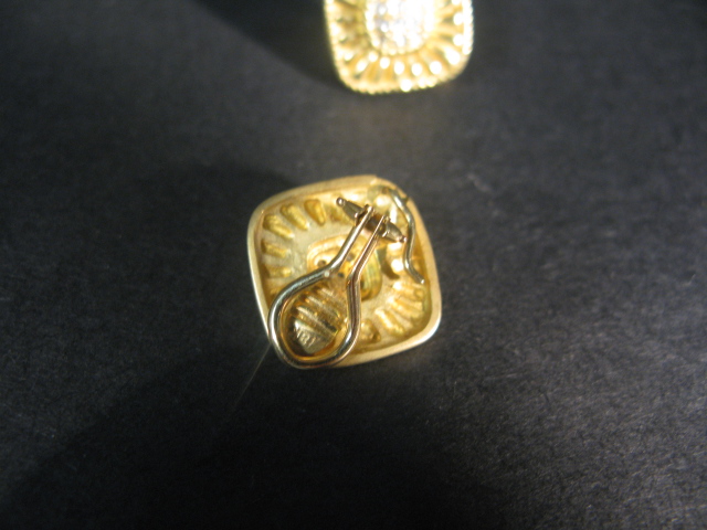 Pair of 18K gold earrings set with small diamonds.