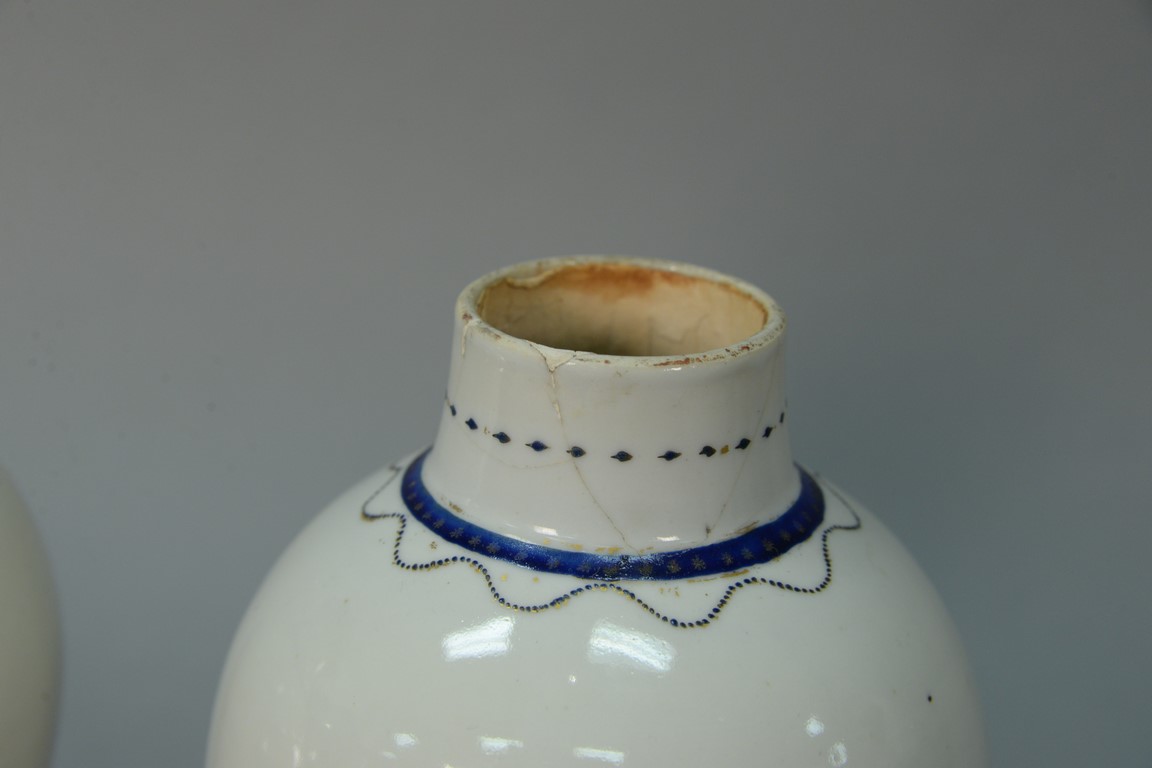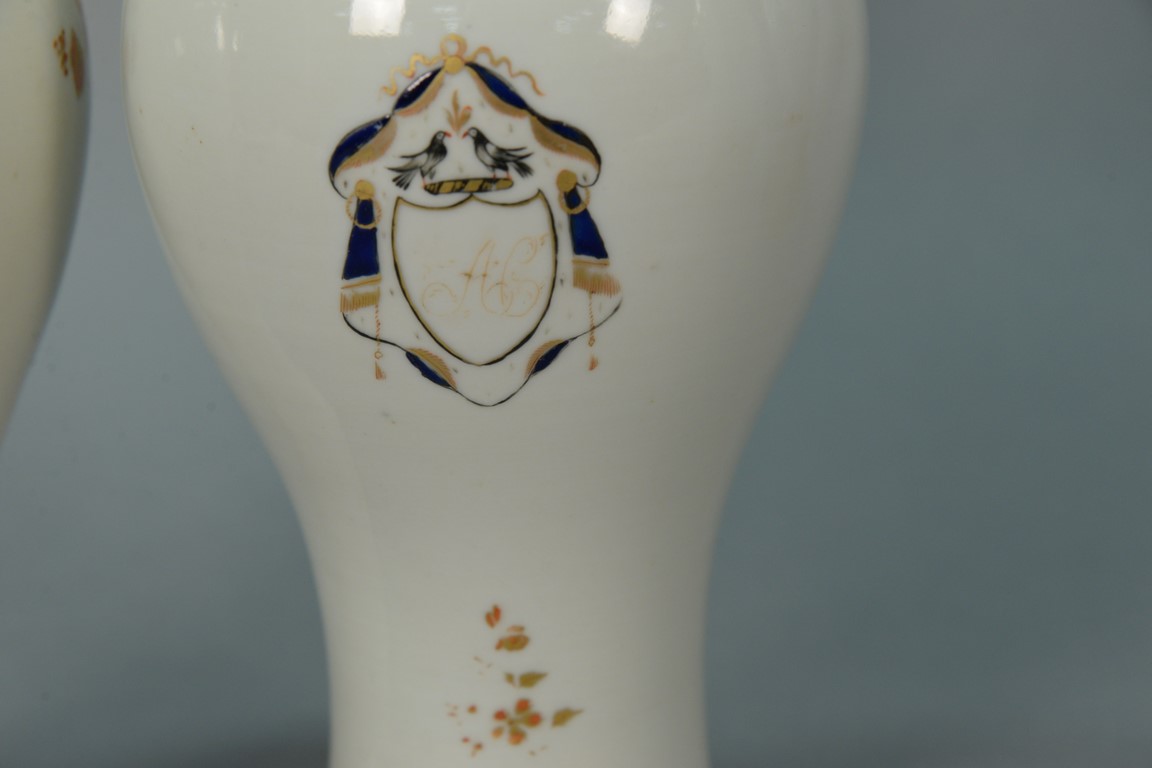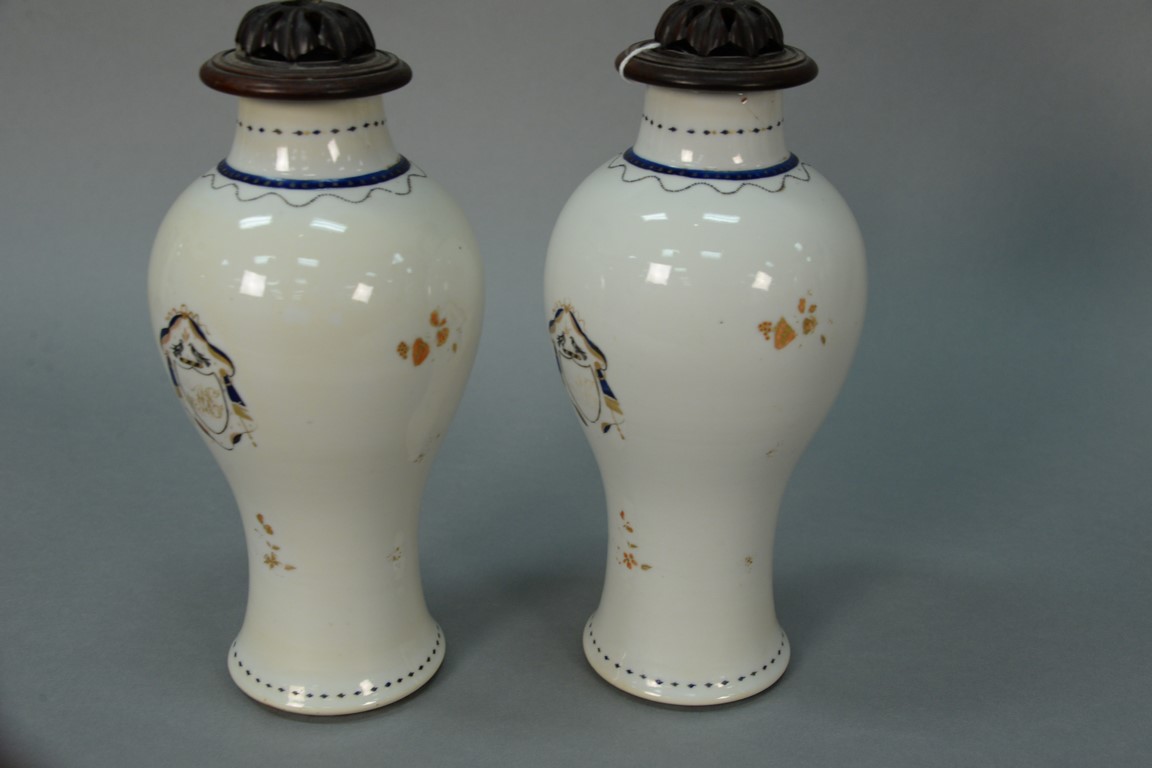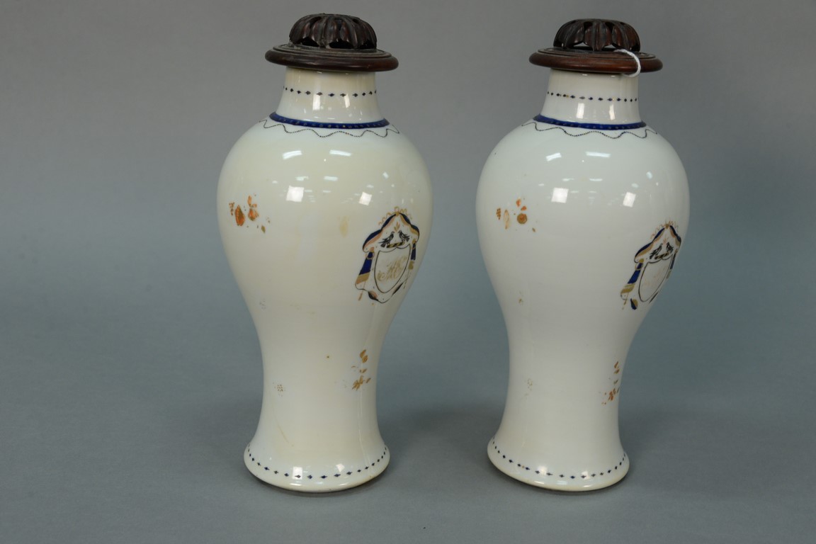 Lot 11: Pair of Chinese export porcelain covered vases with teak tops, each painted with coat of arms. one repaired height 11 inches