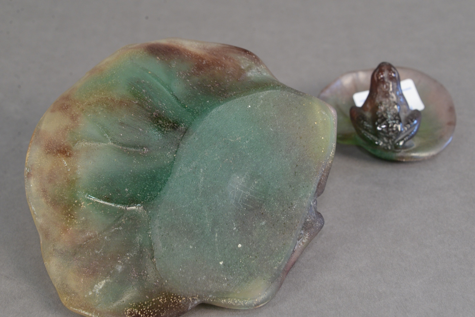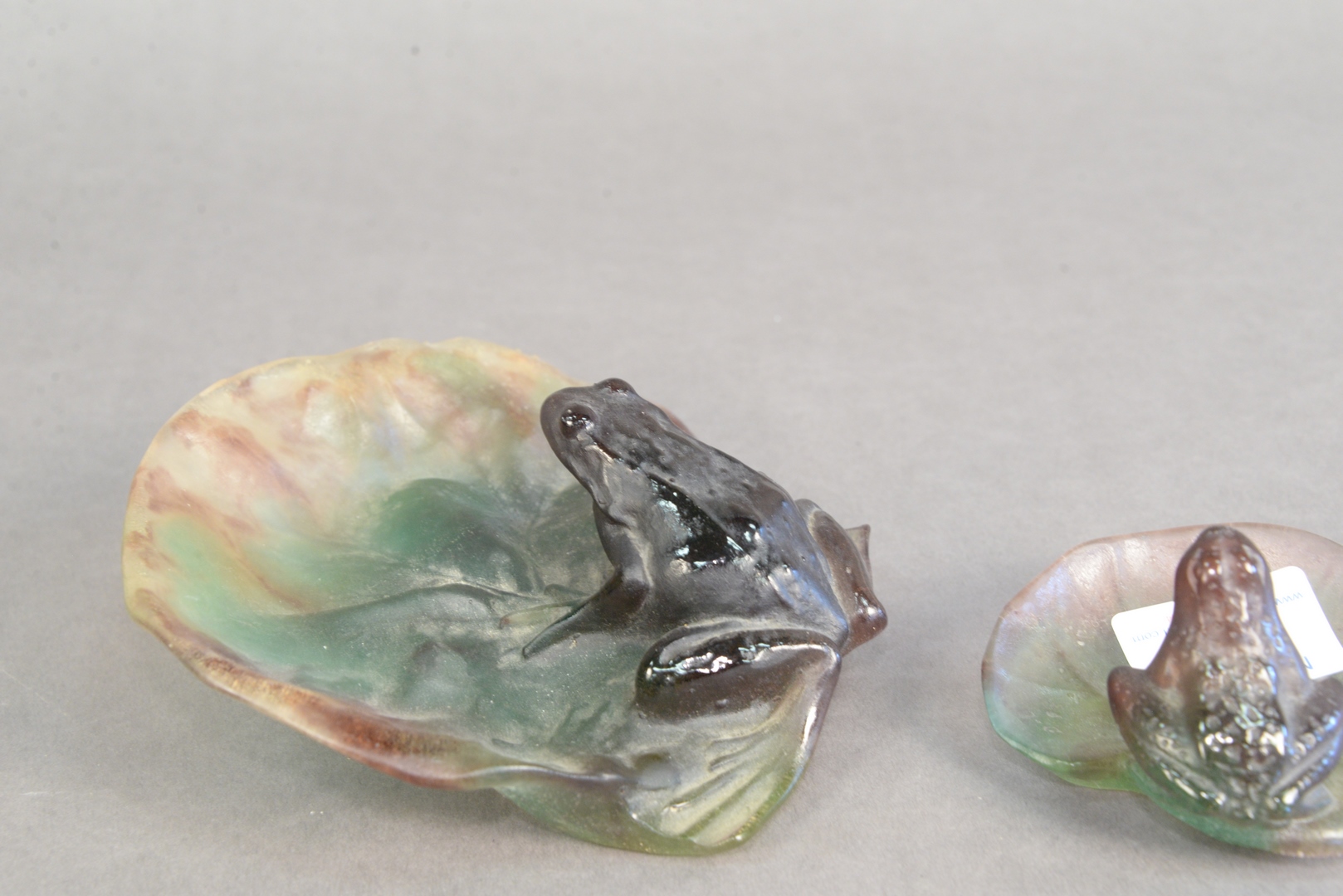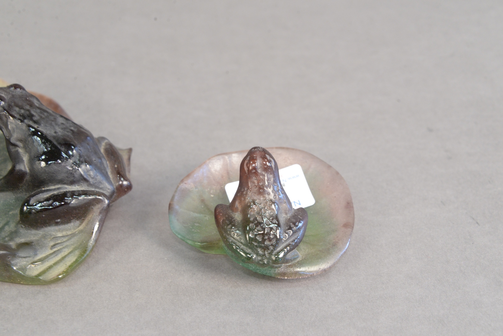 Lot 11: Pair of Daum Glass Frogs on Lily Pads, signed on bottom “Daum, France”, lengths: 3 1/4 and 6 1/4 inches.