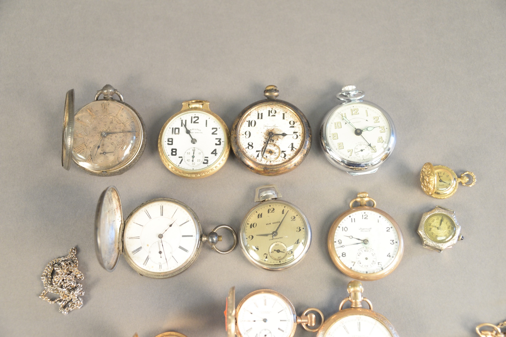 Lot 11: Seventeen Watches and Two Chains, to include pocket watches, lapel watches, one wristwatch, silver, gold plated, etc.