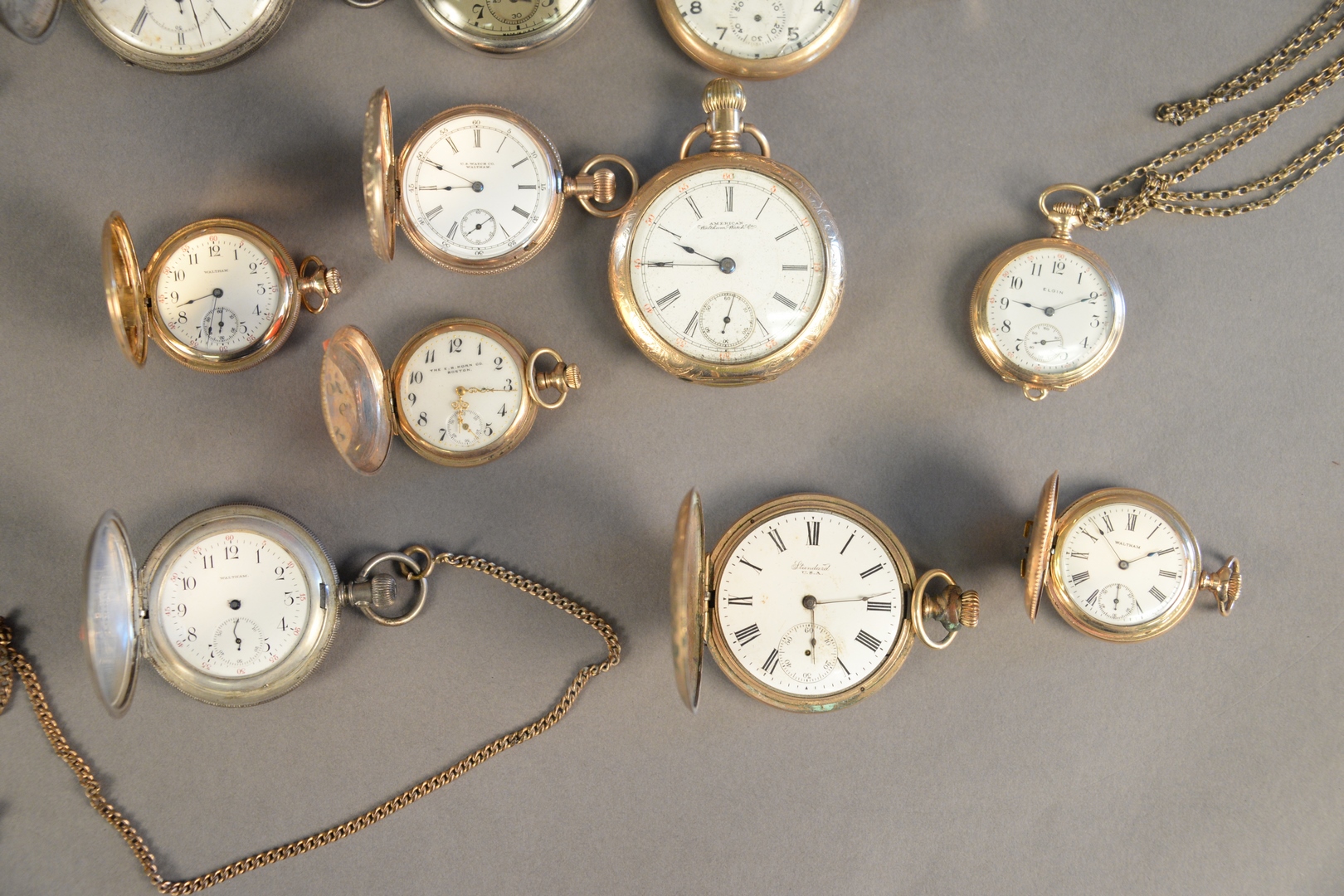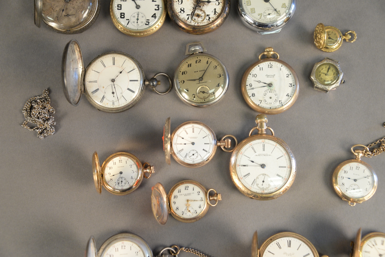 Seventeen Watches and Two Chains, to include pocket watches, lapel watches, one wristwatch, silver, gold plated, etc.