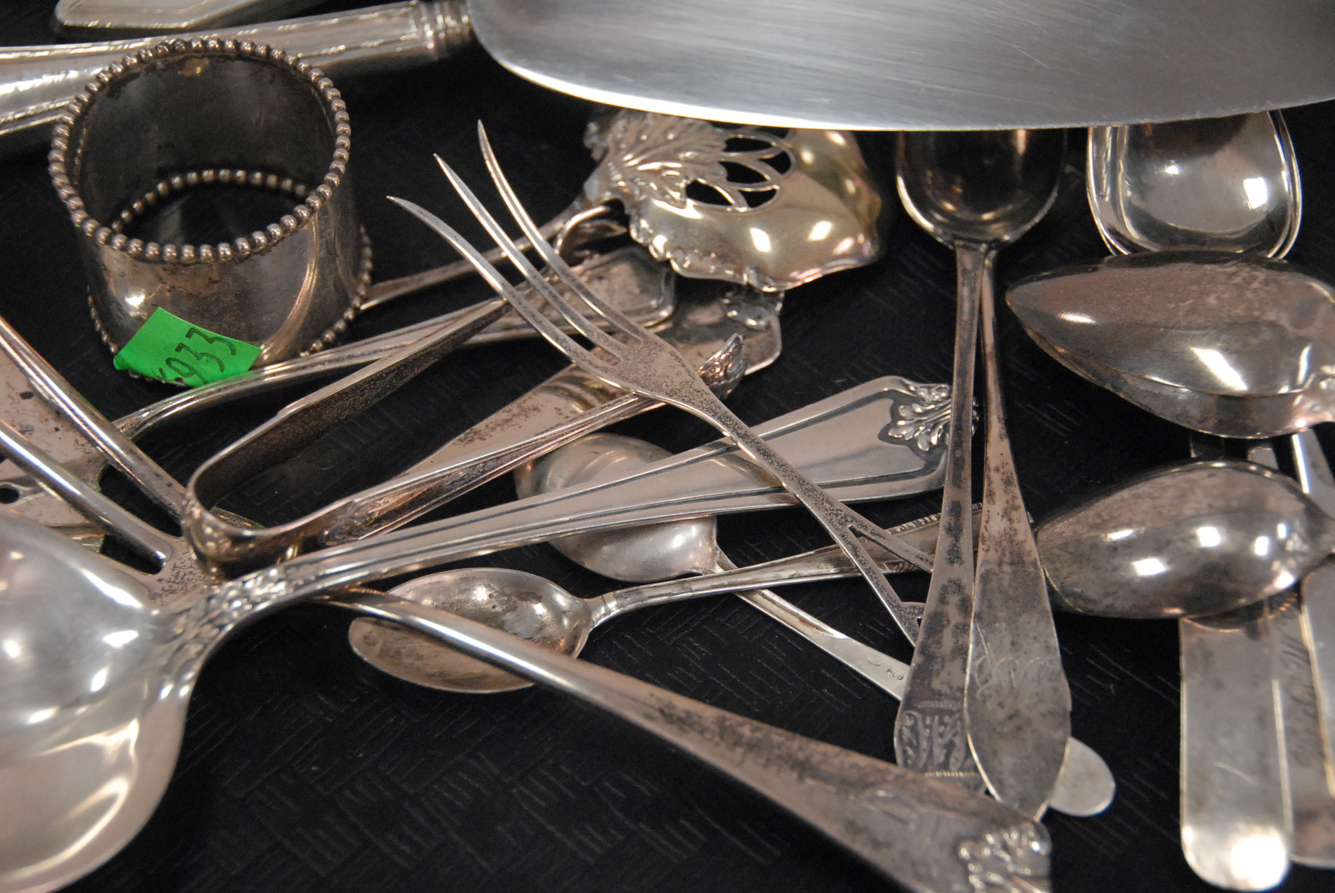 Lot 11: Silver lot to include 7.6 t oz. of sterling, 5.6 t oz. of coin silver, 4 weighted handles, and silver overlay coaster.
