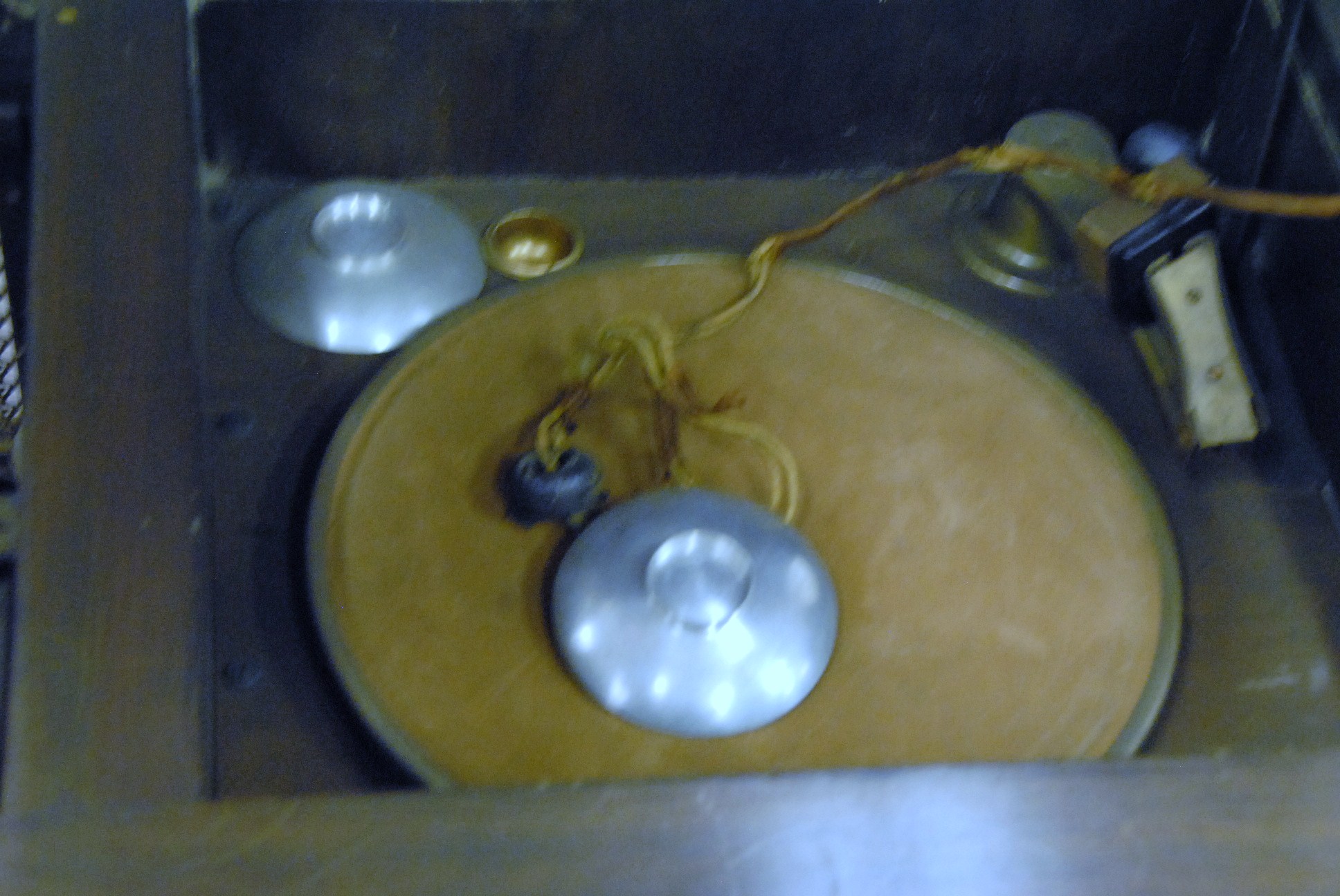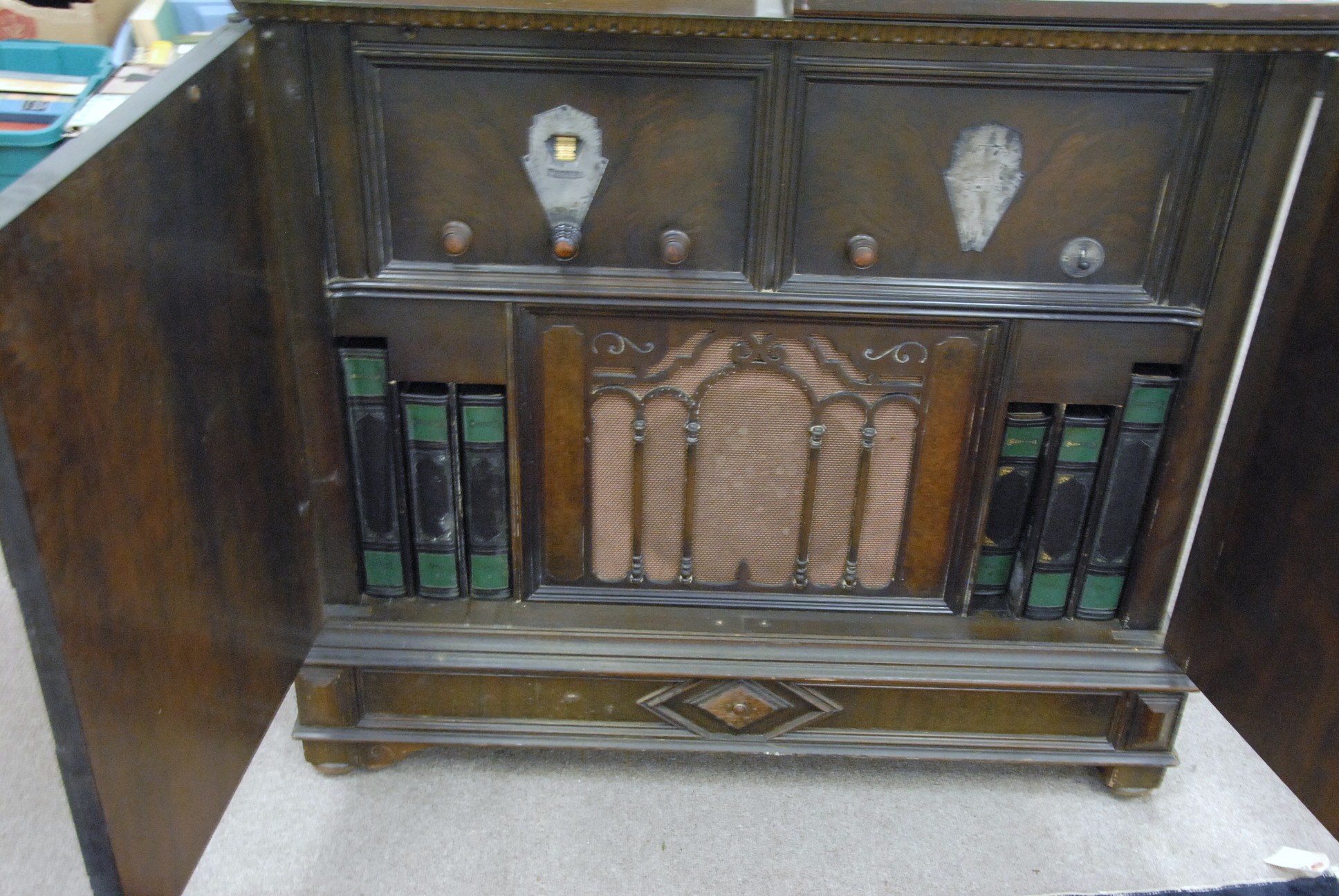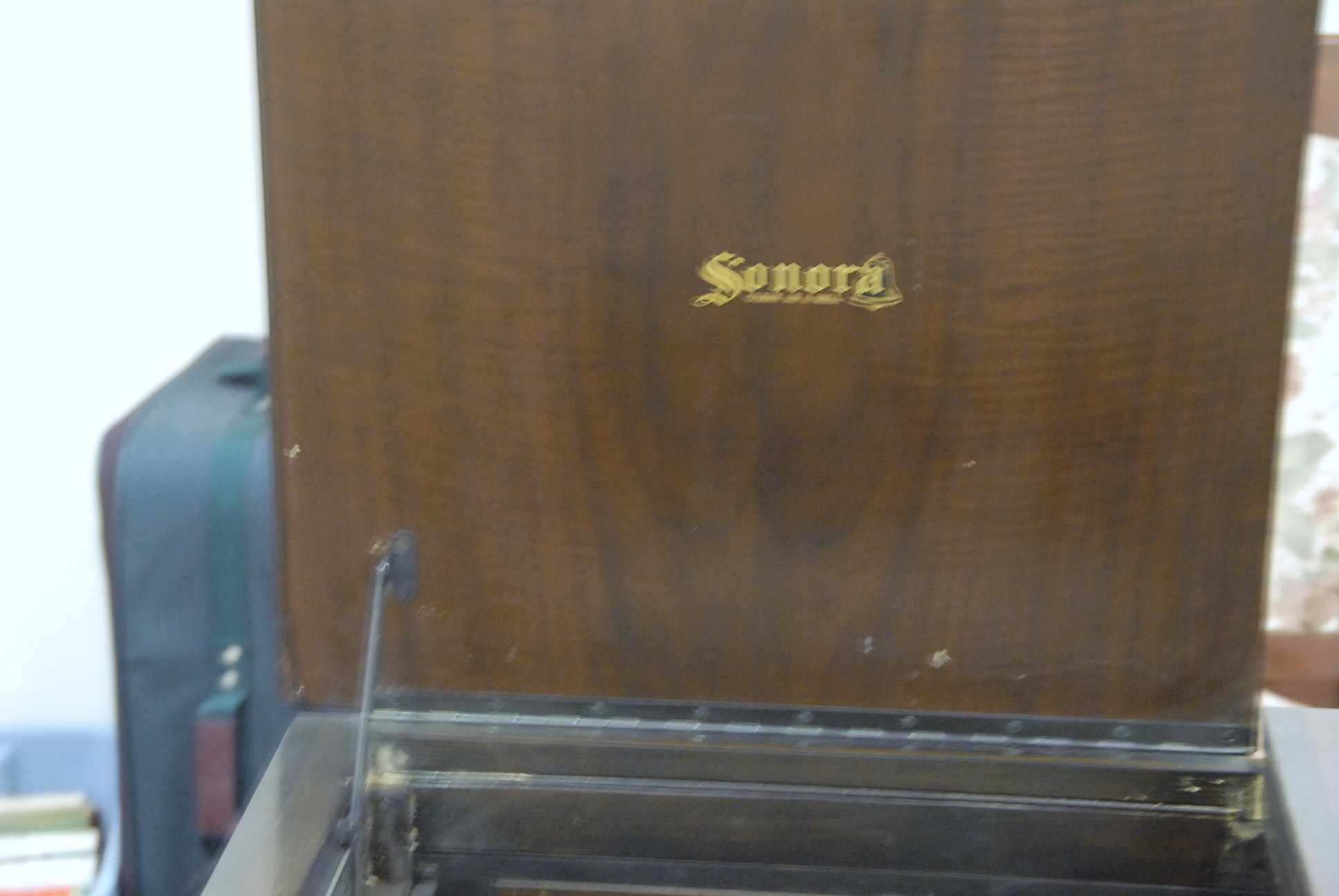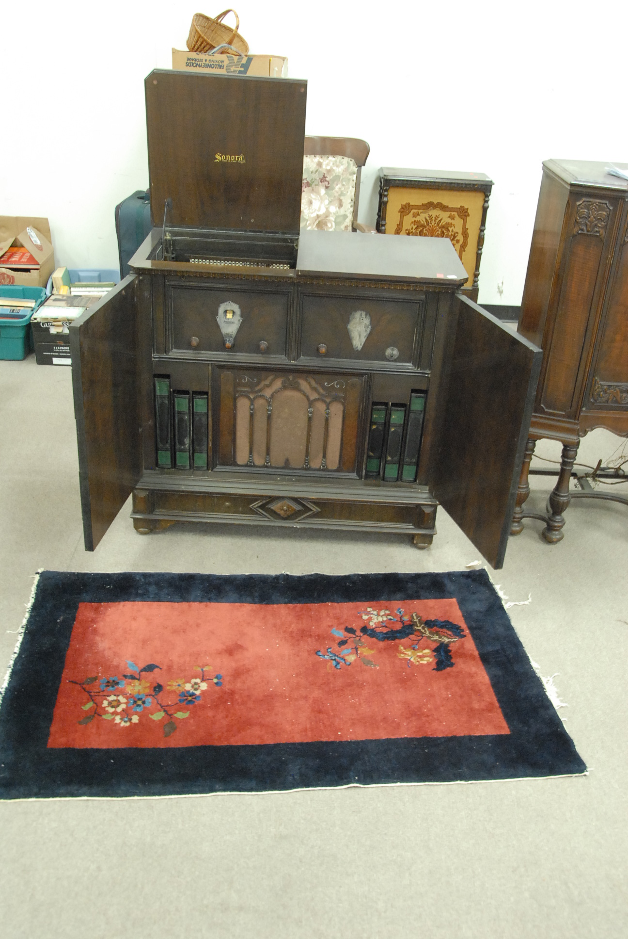 Sonora radio/record player in a vintage walnut cabinet, with records, tubes missing along with an Oriental throw rug