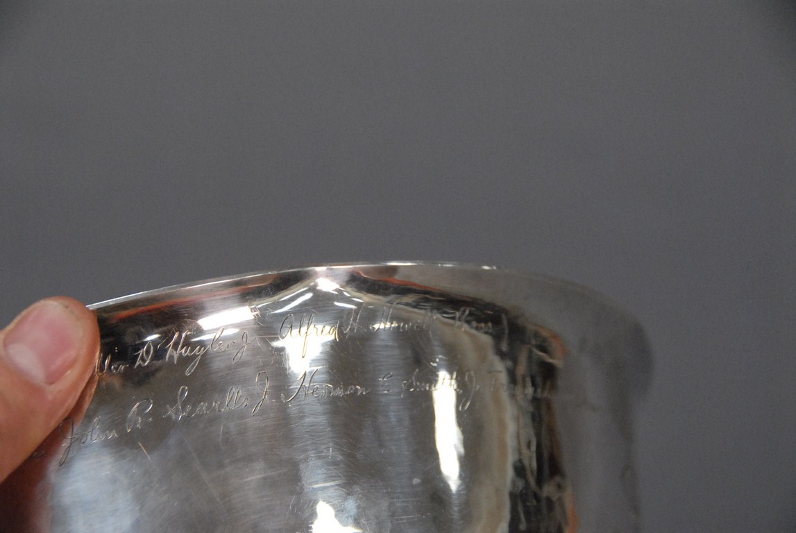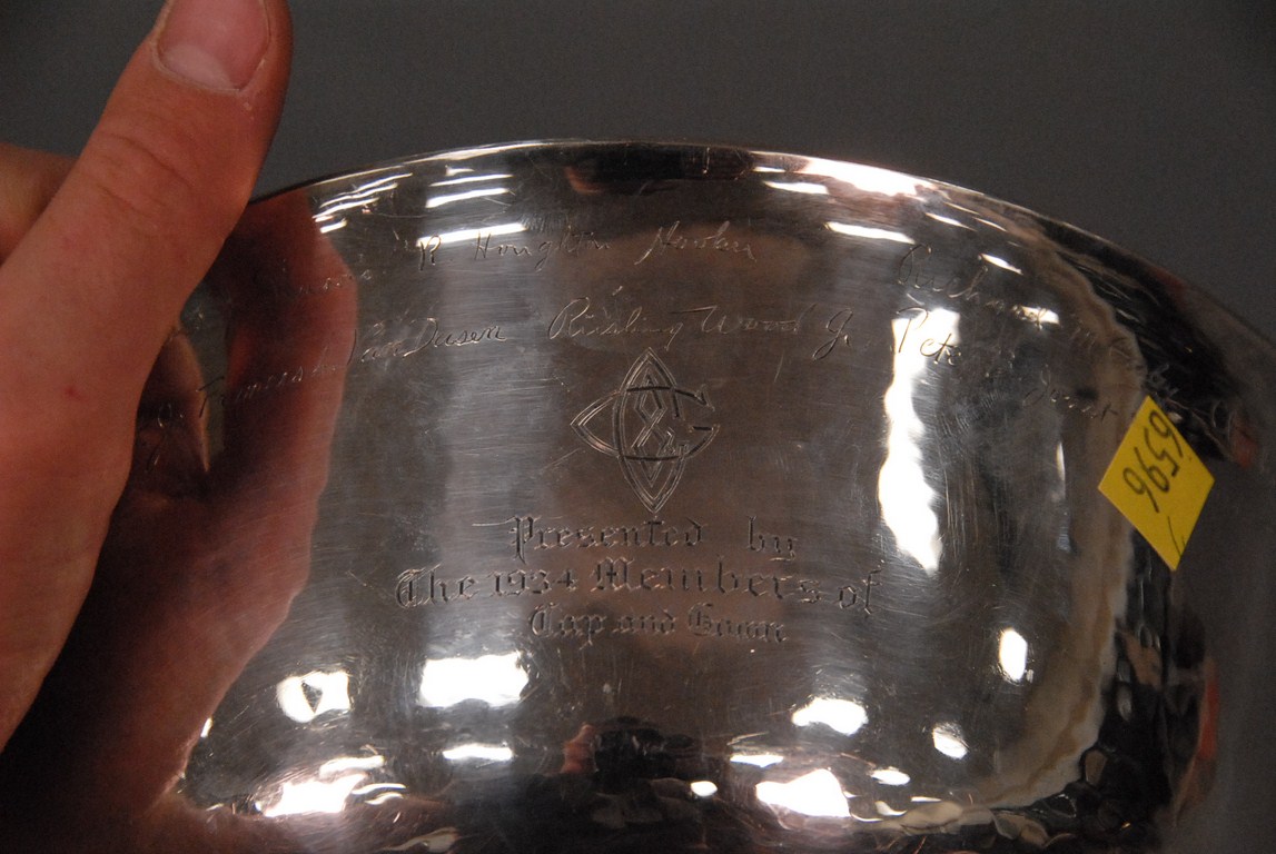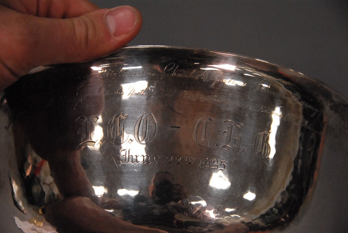 Sterling silver revere style bowl, monogrammed. dia. 10in. 29.5 t oz.
