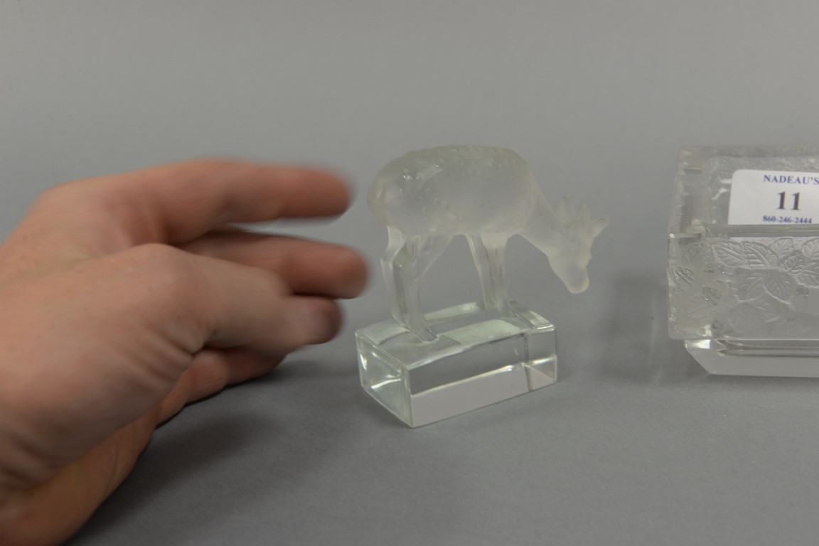 Lot 11: Two Lalique crystal pieces including a deer, ht. 3 1/4in. chipped and a square dish with leaves, ht. 2in., wd. 3 1/2in.