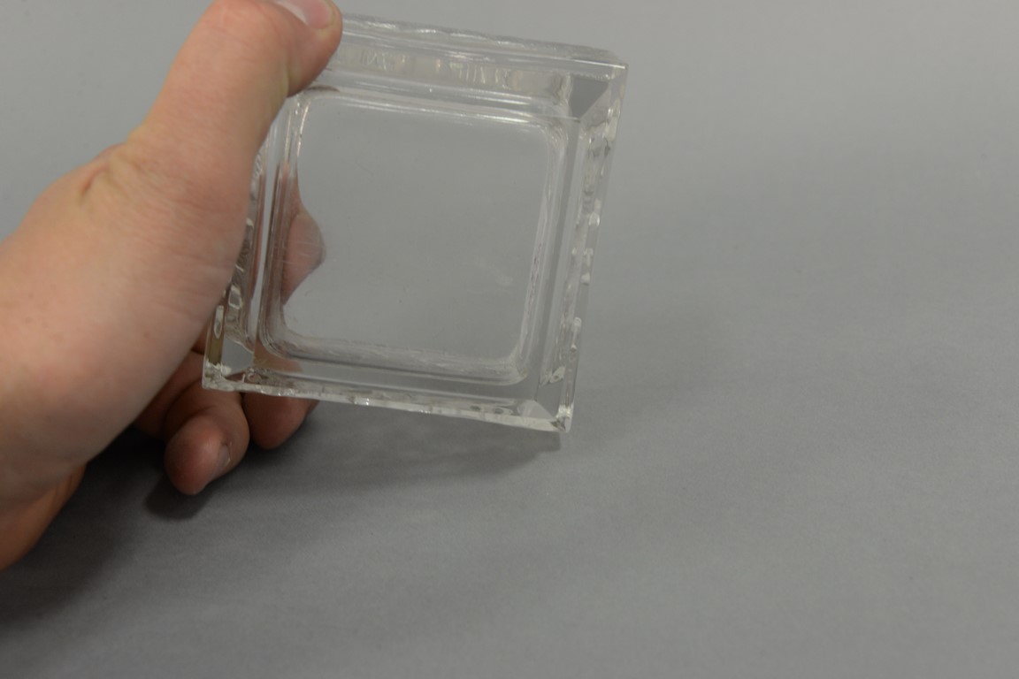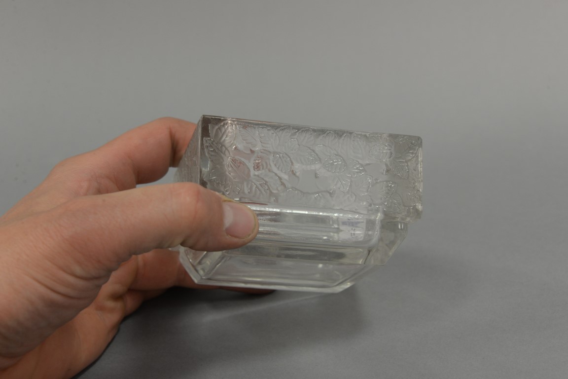 Two Lalique crystal pieces including a deer, ht. 3 1/4in. chipped and a square dish with leaves, ht. 2in., wd. 3 1/2in.
