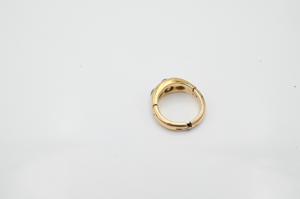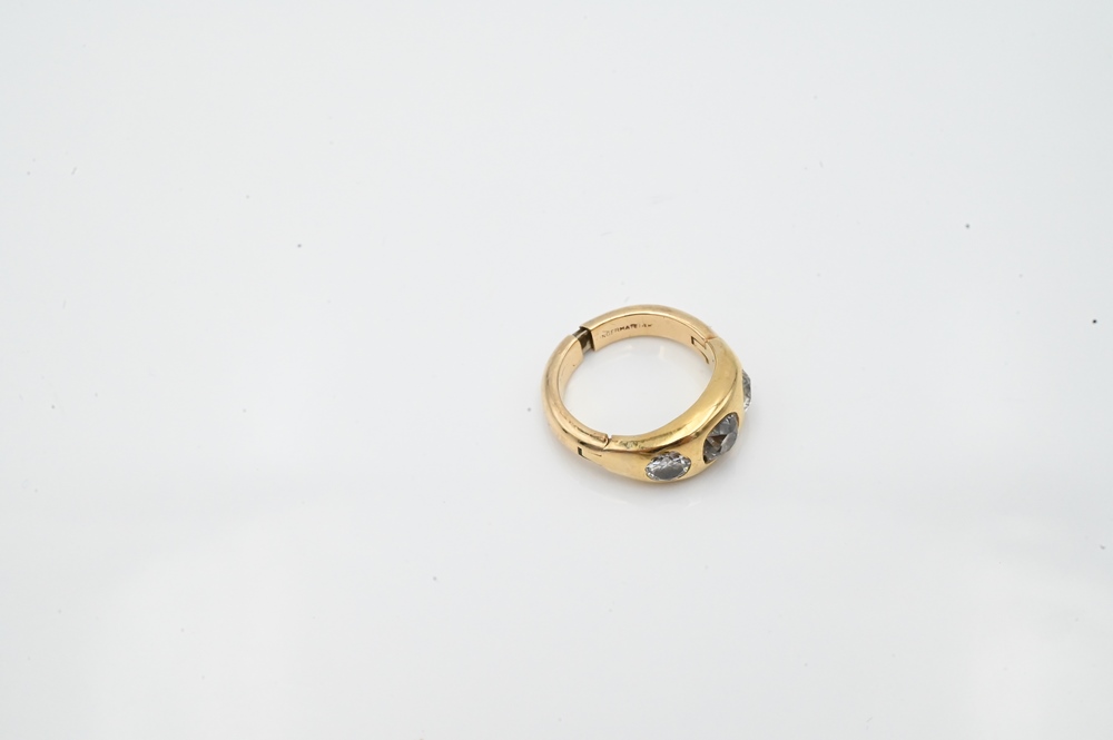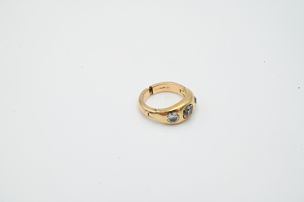 14 Karat Yellow Gold Hinged Ring, set with center cushion cut diamond, approximately 5.3mm x 6mm, flanked by round diamonds, approximately 4.8 millimeters each, size 5 1/4, 7.8 grams.